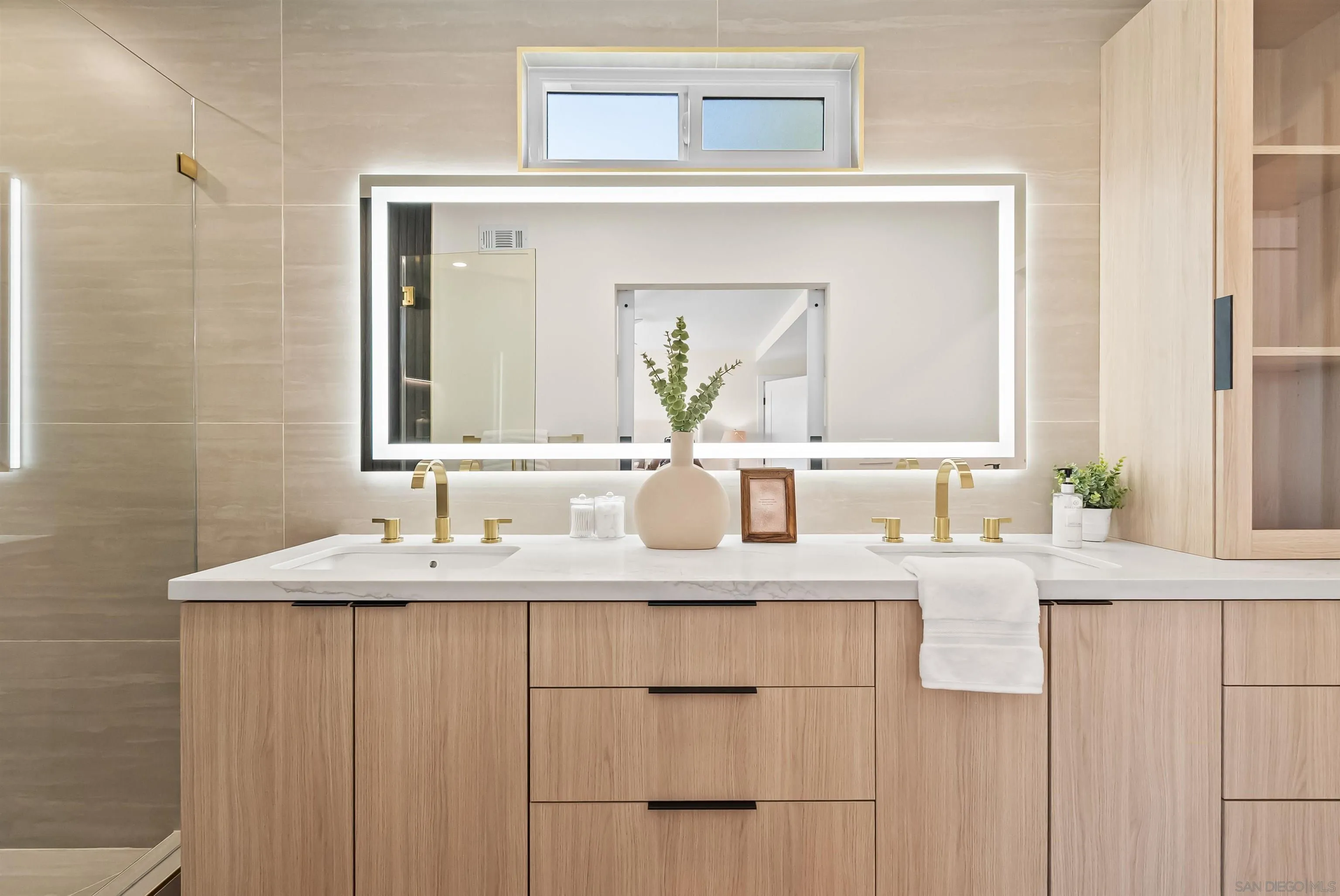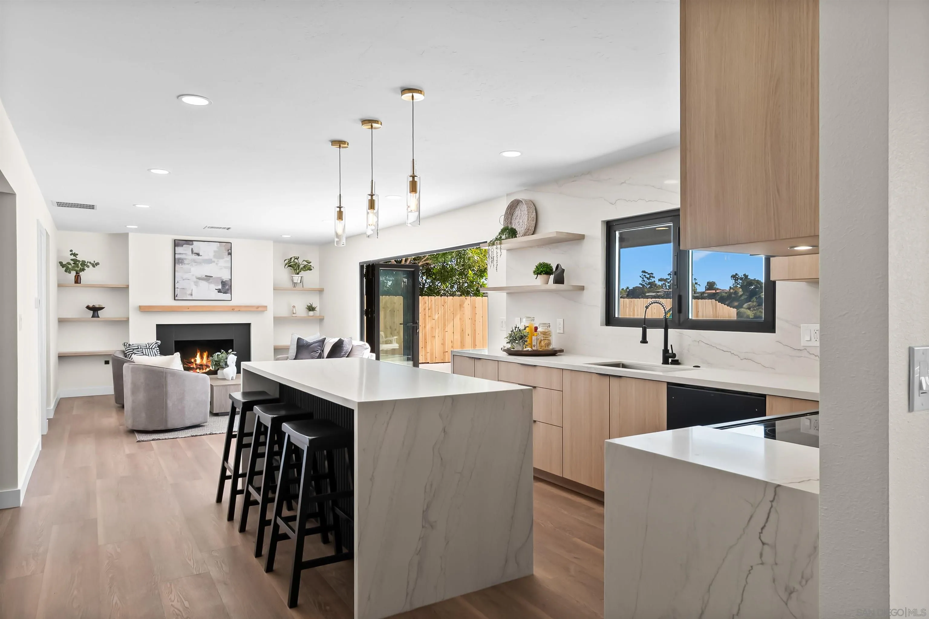 Experience modern coastal living in this fully remodeled five-bedroom, three-and-a-half-bath home in highly desirable University City. Set on a 9,100 sq. ft. lot, this residence features vaulted ceilings, abundant natural light, and a gourmet kitchen with waterfall-edge quartz counters, custom oak cabinetry, and a large island. Enjoy seamless indoor-outdoor living with 12-foot cantina doors opening to a landscaped backyard with west-facing canyon views, a refinished pool, and multiple decks—including a private deck off the primary suite. Flexible layout offers dual primary suites, designer bathrooms, and wide-plank luxury vinyl flooring throughout. Additional highlights include a three-car garage and a quiet cul-de-sac location near top schools, beaches, parks, shopping, and dining.