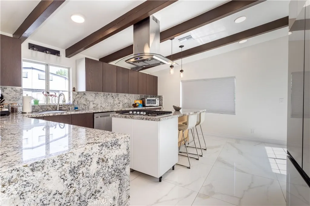 This beautiful Mid-Century home is nestled on a quiet picturesque street in one of Resedas most sought-after neighborhoods, and was designed by one of Los Angeles most renowned architects, Edward Fickett. Here are just a few of its many other fine features: NEW CUSTOM DESIGNED KITCHEN, NEW MAIN BATHROOM. Mature shade tree, lush landscaping, planters filled with a myriad of rose bushes, and groomed shrubbery youll immediately recognize the true Pride-Of-Ownership Custom double doors open to a flowing 1,355 square foot open concept floor plan that is in Move-In-Condition with HIGH WOOD BEAMED CEILINGS, NEW RECESSED LIGHTING, a designer paint scheme, and the complementary blend of newer laminate and tile flooring. The spacious living room is bathed in natural light from a huge picture window, and complemented by a gas-burning fireplace with custom tiled hearth. Any gourmet cook will truly appreciate the beautifully NEW kitchens abundant soft close cabinets, ample granite counters with full back-splash, center island with custom pendant lighting and built-in wrap around breakfast bar, deep basin steel sink with custom faucet, newer built-in stainless-steel appliances, gas cook-top with contemporary glass/stainless steel ventilation hood, plus the convenience of the very large adjoining dining area. A total of 3 bright and spacious bedrooms. 1 beautifully appointed bathrooms. Functionally located laundry room. Energy efficient dual pane windows will help keep your utility bills low and the interior very quiet. Central heat & air for year-round comfort. Youre going to appreciate