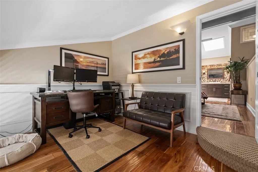 **Impeccably Upgraded with Premium Finishes Throughout** Tucked into the tranquil, tree-lined community of The Lakes, 26 Lakepines is a beautifully remodeled 1-bedroom + office, 1.5-bath townhome with over $75,000 in high-quality upgrades. Every inch of this home reflects thoughtful craftsmanship,from the boxed staircase with wrought iron railing to the extensive wainscoting, crown molding, and upgraded paneled doors. The remodeled kitchen features granite countertops, stainless steel appliances, newer wood cabinetry with cabinetry that extends above and around the refrigerator, a breakfast bar with overhang, pendant lighting, and a full porcelain tile backsplash. The entry, kitchen, and powder room are finished with rich tile flooring, while the living and dining areas offer recessed lighting, smooth ceilings, hardwood floors, and plantation shutters. The downstairs powder bath includes designer finishes and full-height tile surround. Upstairs, the vaulted primary suite offers a skylight, ceiling fan, walk-in closet with organizer, and a fully renovated bathroom with granite counters, a raised vanity with vessel sink, stacked-stone backsplash, framed mirror, and a custom walk-in shower. A dedicated upstairs bonus room or office provides valuable additional living space, complete with hardwood flooring, a storage closet, wainscoting, and shutters for privacy and light control. The private fenced backyard is perfect for entertaining or relaxing outdoors, complete with paver stone hardscape, a raised stone planter, a BBQ ledge, mature landscaping, and a retractable awning for