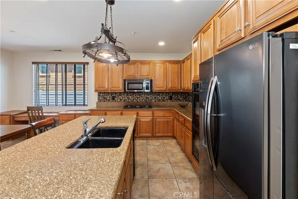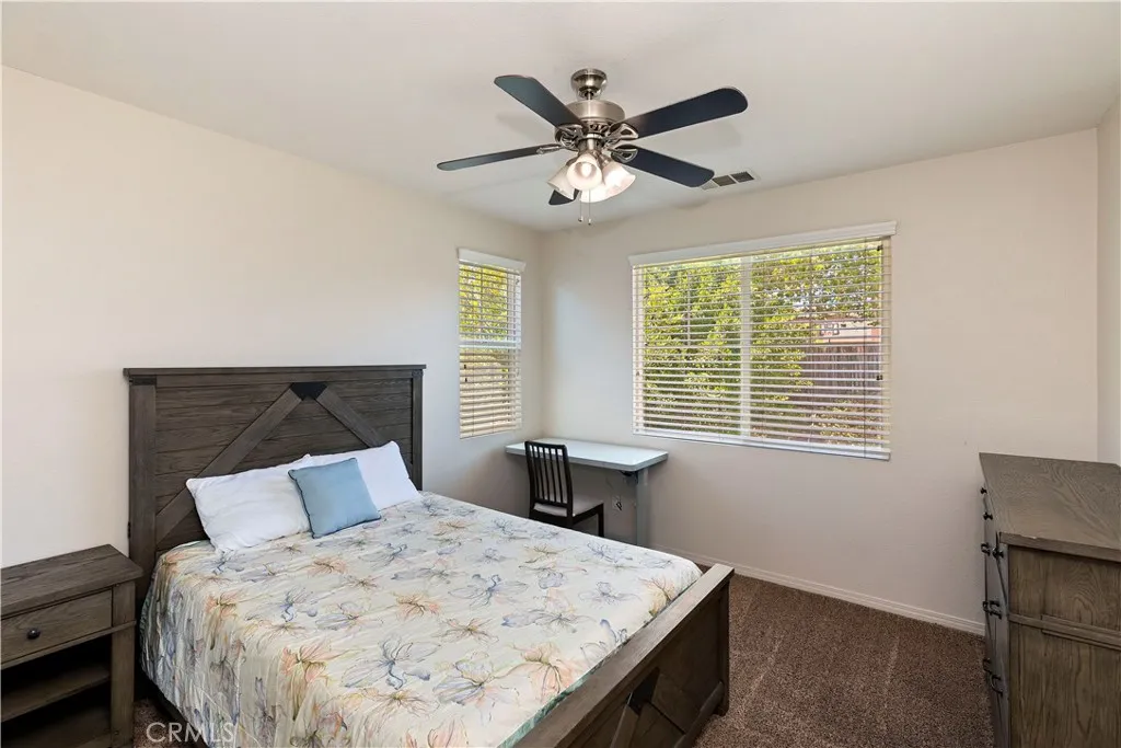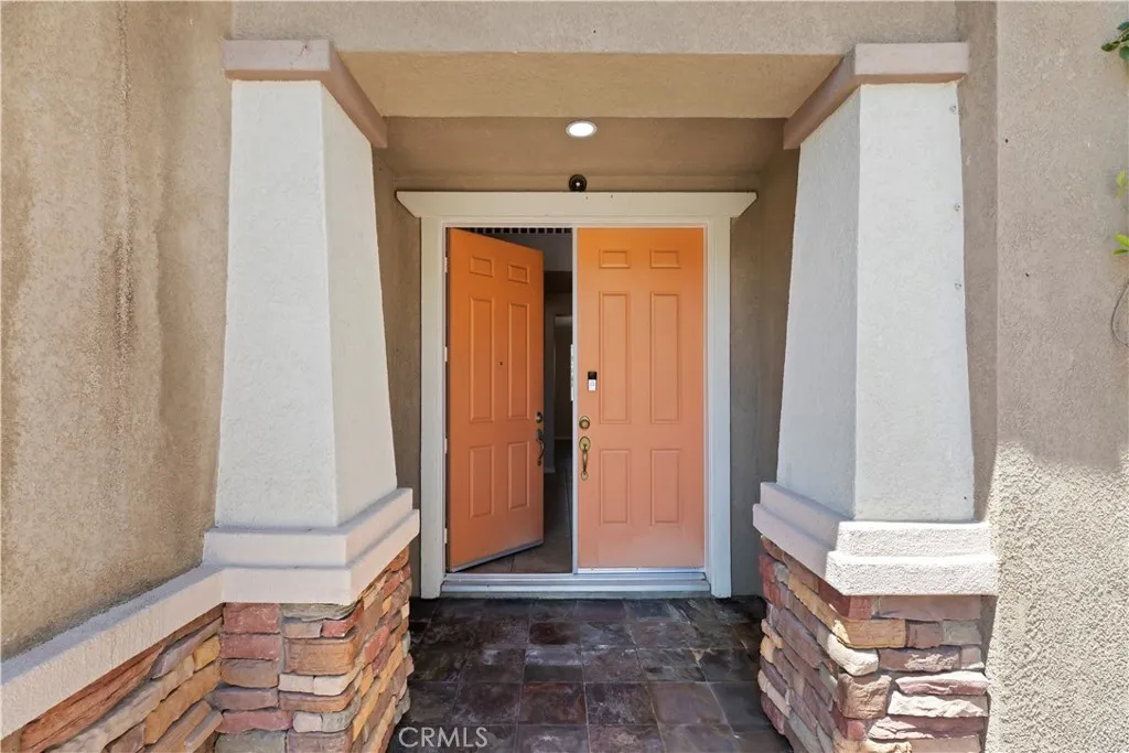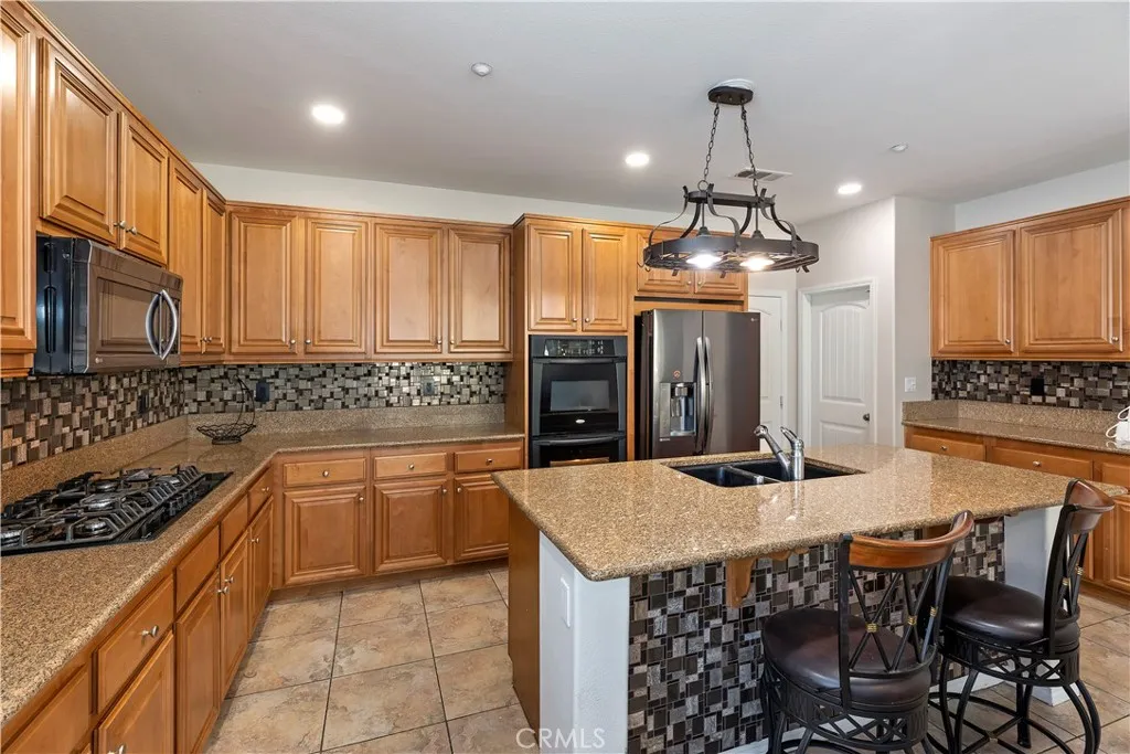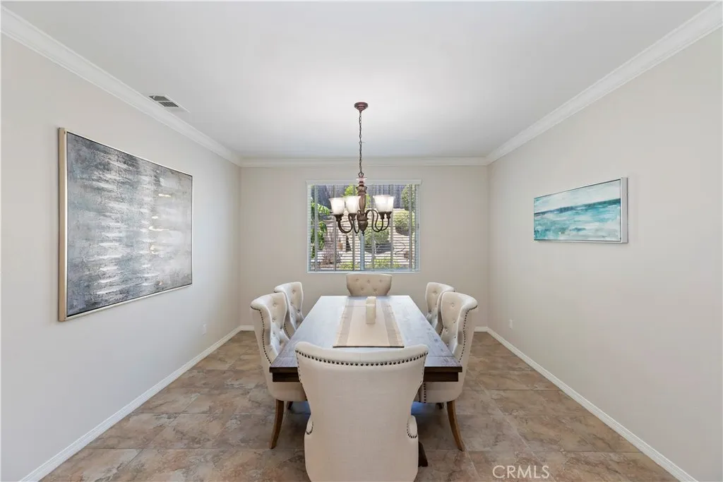 Located just up the street from the prestigious Woodcrest Christian School, this beautifully maintained 5-bedroom home in Riversides sought-after Orangecrest neighborhood offers the ideal layout for families and multigenerational living. Step inside to elegance with soaring ceilings, crown molding, recessed lighting, and contemporary interior paint that set the tone for this casually refined home. The open-concept kitchen features granite countertops, a designer tile backsplash, rich wood cabinetry, stainless steel appliances, and a large island with bar seating next to a dining area perfect for casual meals or hosting. The adjoining family room features wood-look tile flooring, a stacked stone fireplace, built-in media center, and custom shelving all opening to a backyard made for entertaining. The first-floor bedroom with its own upgraded ensuite bath is perfect for guests or in-laws, while the formal dining room adds a touch of elegance for holidays and special occasions. Upstairs, the spacious primary suite offers upgraded baseboards, a ceiling fan, and an ensuite with double sinks, a soaking tub, walk-in shower, and oversized closet. Across the hall, the versatile bonus room provides space to work, relax, play or make it your own Home Theatre! Three more secondary bedrooms -- each with ceiling fans and ample storage -- including a Jack-and-Jill bath and an additional full hallway bath. The backyard is your private retreat, featuring a covered Alumawood patio, built-in fire pits, a media wall, cement patio seating, mature landscaping, a dog run, and even a small turtle