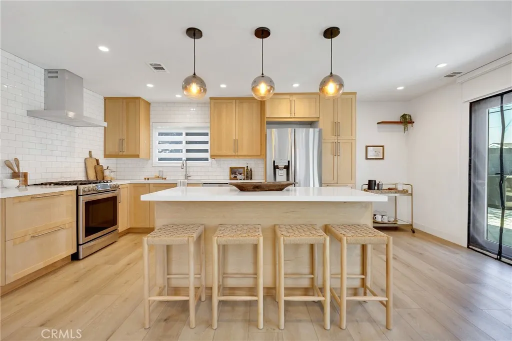 Welcome to 421 Larry Lane, a charming mid-century modern home nestled in the highly sought-after city of Placentia! This beautifully updated 3 bedroom, 2 bath residence features high vaulted ceilings and oversized windows that fill the home with natural light, creating a spacious, clean, and functional living space. The expansive living room flows effortlessly into the updated kitchen and dining area, perfect for everyday living and entertaining. The kitchen is sleek and modern, showcasing a subway tile backsplash, quartz countertops, new stainless steel appliances, and a generous eat-in island with ample space for cooking and gathering. The cozy dining room features a warm fireplace and newer sliding glass doors that open to a large backyard oasis complete with a built-in BBQ and a stylish new pergola, ideal for outdoor entertaining. Downstairs, the two spacious bedrooms offer custom built-in closet shelving and easy access to the tastefully remodeled hall bathroom, conveniently located near the kitchen and dining areas. Upstairs, the private primary suite provides a peaceful retreat with its own updated en-suite bathroom, designed with simplicity and modern elegance. Additional upgrades include new SPC plank flooring throughout the downstairs, fresh interior and exterior paint, a sleek gated front patio, and added concrete in both the front driveway and backyard for extra functionality. The attached 2-car garage is equipped with A/C and built-in storage, making it perfect for a home office or gym setup. Included in the sale are a new washer/dryer, refrigerator, and a smar