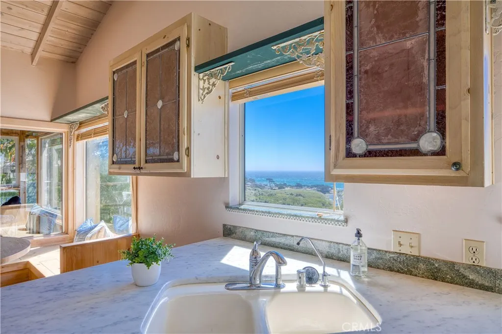 Unique Artists Retreat with Panoramic Ocean Views! Nestled in the desirable Happy Hills area overlooking Moonstone Beach, this distinctive property offers a 3-bedroom, 2-bath main home of approx. 1,930 sq. ft. plus a lower-level studio of approx. 500 sq. ft. Perfect as a private retreat, multi-generational living, or income opportunity, the home showcases sweeping ocean views from multiple vantage points. The main residence features vaulted wood-plank ceilings, travertine floors, and decorative stained-glass accents. An updated kitchen opens to the dining area, where large picture windows with built-in window seats frame the views and provide access to an enclosed deckan ideal spot to relax and take in the scenery. Adjacent, the living room centers around a cozy fireplace, with stairs leading to the converted garage, formerly an art studio, easily repurposed as a family room. A half bath completes the main level. Downstairs, the primary suite offers an en-suite bath and private enclosed deck. Two additional bedrooms share a full hall bath and access to a wraparound deck that transitions to a larger covered outdoor space with storage. On its own lower level, the studio includes a full bath, kitchenette, laundry, and a spacious deckan ideal setup for guests, extended family, or rental income while maintaining privacy from the main home. The 5,600 sq. ft. lot is complemented by an additional 2,575 sq. ft. parcel with meandering walking paths and seating areas, creating a serene, forest-like setting. Just minutes from charming shops, restaurants, and the iconic Moonstone Beach