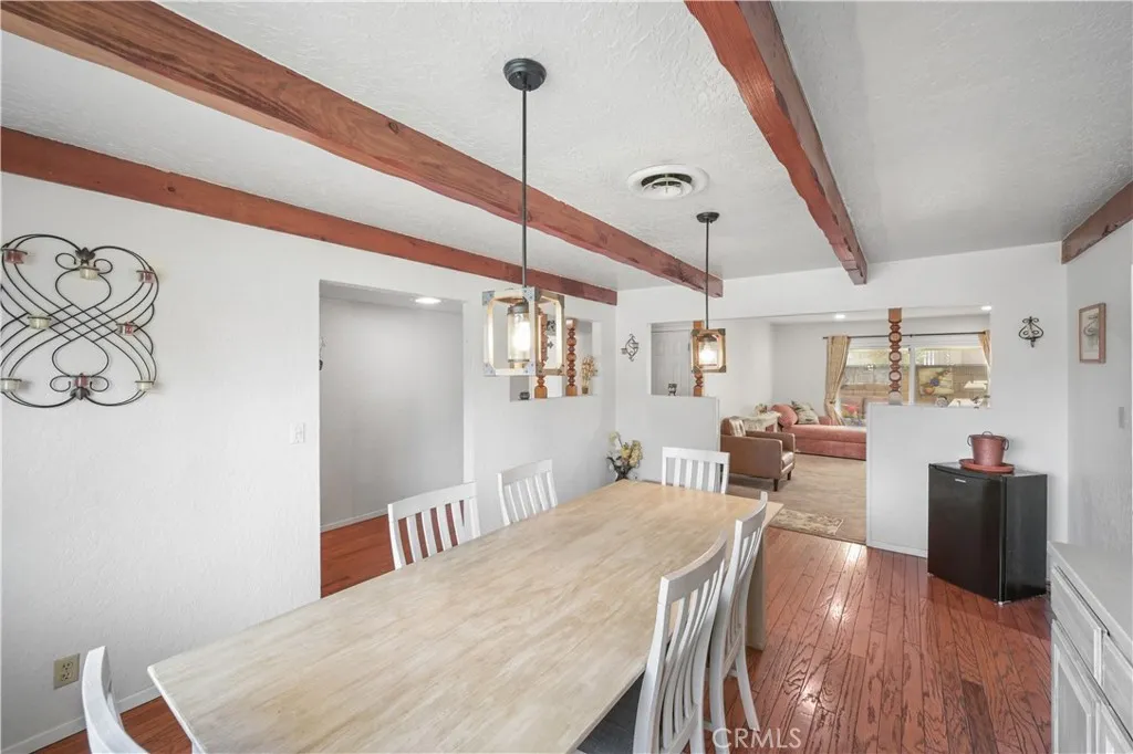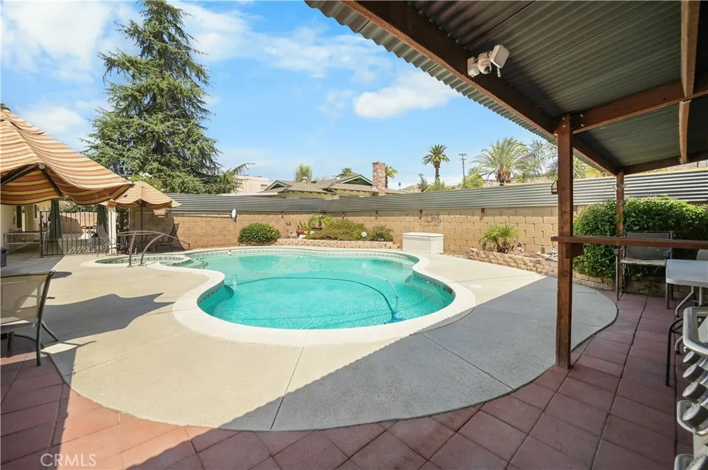Nestled in the heart of Hemet, CA, this charming single-story home offers an idyllic retreat with a harmonious blend of comfort and style. This 4-bedroom, 2.5-bath residence features exquisite exposed beams in the dining room, adding a touch of rustic elegance to your family gatherings. The spacious living area boasts a large fireplace, perfect for cozy evenings. Outdoors, a beautifully landscaped yard includes mature LEMON, PEACH and NECTARINE trees. Unwind with a sparkling pool and spa providing a luxurious oasis for relaxation. Entertain guests with ease at the wet bar, and enjoy ample storage space in the oversized garage. Located in a vibrant community, this home is close to local attractions such as the Western Science Center, Diamond Valley Lake, and the Ramona Bowl Amphitheatre, offering a variety of recreational and cultural activities. Whether you're seeking tranquility or adventure, this Hemet gem provides the perfect backdrop for your Southern California lifestyle.