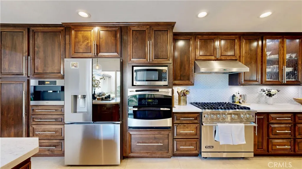 Nestled within the coveted Griswolds gated community, this impeccably maintained residence showcases the largest floor plan offered and has been thoughtfully enhanced with fresh interior paint, new lighting throughout, a brand-new electrical panel, and beautifully updated second-level bathrooms. A grand living room flows seamlessly into the spacious family room with soaring vaulted ceilings, while a separate formal dining area with a built-in bar sets the stage for elegant entertaining. The fully remodeled gourmet kitchen is a culinary masterpiece, featuring quartz countertops, designer-coordinated backsplash, custom cabinetry with decorative glass inserts, a deep undermount sink, and top-of-the-line stainless steel appliances including a Viking Professional Range with Xtreme Air hood, Bosch dishwasher, dual-control wine refrigerator, and a Miele built-in coffee system. Recessed can lighting enhances the kitchens sophisticated ambiance. Double-pane Milgard windows and sliding doors frame serene views and fill the home with natural light. An indoor laundry room adds everyday convenience, while the elegant primary suite boasts a spa-inspired bathroom. Upstairs, a versatile loft offers the perfect space for a home office, fitness studio, library, or potential additional bedroom. A generous balcony shared by the second and third bedrooms provides a peaceful retreat with picturesque foothill views. The two-car attached garage features durable metal shelving for organized storage. Designed for effortless entertaining, the open-concept layout flows to a low-maintenance backyard wi