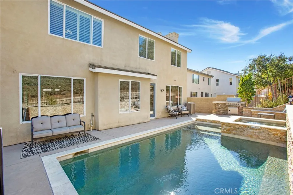 UPGRADED OLINDA RANCH HOME ONE OF ONLY A HANDFUL OF HOMES IN THE COMMUNITY WITH A POOL & SPA! Nestled in the highly desirable Olinda Ranch community of Brea, this beautifully crafted 5-bedroom, 3-bathroom home blends elegance, comfort, and functionality with soaring ceilings, new carpet, plantation shutters, dual-pane windows, and recessed lighting that fill the open floor plan with natural light. The layout flows seamlessly from the formal living and dining rooms into the gourmet kitchen and family room, creating the perfect setting for everyday living and entertaining. The kitchen showcases rich wood cabinetry, quartz countertops, stainless steel appliances, a built-in microwave and oven, a central island with bar seating, and open views of the inviting family room with a cozy decorative fireplace. A versatile downstairs bedroom with a nearby full bathroomfeaturing a sliding glass shower door, stylish tiled backsplash, modern fixtures, and built-in floating shelvingmakes an ideal guest suite, office, or multi-generational living option. Upstairs, a built-in desk area provides a convenient workspace, while the generously sized secondary bedrooms feature ceiling fans and ample closet space. The hallway bathroom includes dual sinks, a privacy toilet door, and a walk-in glass shower, designed for convenience. The luxurious primary suite is a private retreat with plantation shutters, a spa-inspired ensuite highlighted by a soaking tub and walk-in glass shower with beautiful tile accents, dual vanity, privacy toilet door, and a spacious walk-in closet. The backyard is a true e