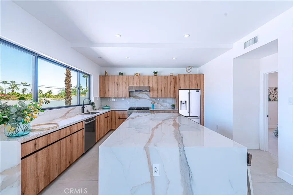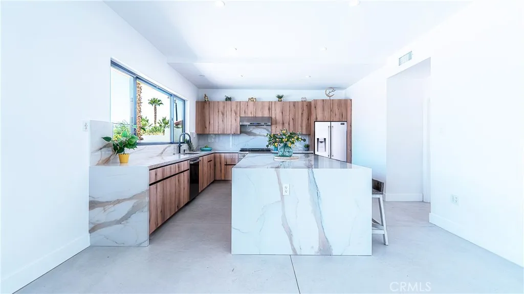 Welcome to South Palm Desert, where style meets comfort just minutes from El Paseos dining, shopping, and entertainment. This home has been completely reimagined with thoughtful upgrades inside and out, offering the perfect balance of modern convenience and resort-style living. Step inside to an open, airy layout with brand-new insulation, drywall, and polished concrete floors. The new kitchen is the heart of the home, designed with custom cabinetry and a spacious island, while new bathrooms feature sleek walk-in showers and fresh finishes. Expansive windows and entertainers sliding glass doors bring in natural light and open directly to the backyard, creating seamless indoor-outdoor living. Every major system has been replaced, including all-new plumbing, sewer line, dual 4-ton HVAC units, and a 400-amp underground electrical panel with upgraded power lines. Additional improvements include new windows, doors, insulation, and stucco, giving this home a fresh, contemporary feel throughout. Outside, the backyard has been transformed into a private retreat. Enjoy a brand-new saltwater pool and spa with app-based controls, an outdoor shower, new pool system, and professional landscaping with sprinkler and lighting systems. A Tesla charger, new concrete hardscape, and smooth stucco exterior add both function and style. Every detail of this home, from the upgraded systems to the private backyard oasis, has been thoughtfully designed to create a seamless blend of modern comfort and effortless desert living in one of Palm Deserts most desirable neighborhoods.