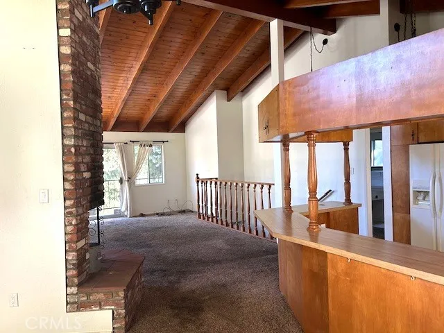 Level entry, tall cathedral wood ceilings, 3 bedrooms and 2 baths, 2-car garage with large workshop plus EXTRA parking. There are two bedrooms on main level with a 3/4 bath; one has a separate exit to outside. Two main bedrooms upper level with full bath. Parking includes two car garage 399 sq.ft. with a full workshop, large laundry room and walk-in pantry closet. There's added parking for RV or boat. Tall knotty pine ceilings on the entire upper floor, including the two main bedrooms and huge living room, spacious kitchen with tons of cabinets and counter space, formal dining area with access to a patio, graced by a floor to ceiling brick fireplace and a front deck that wraps from front to side of house. Rear patio is concrete for your play area. This home gives a sense of 'good bones'. Owner will consider new flooring/carpet in offer. Air conditioning and FAU. Commuter friendly. Just minutes to school, Lake Gregory recreation, fishing and nature hiking. Enjoy your mountain lifestyle with four seasons away from the hassle of city traffic and noise. Neighborhood sits back off the main road for privacy and pleasant surroundings.