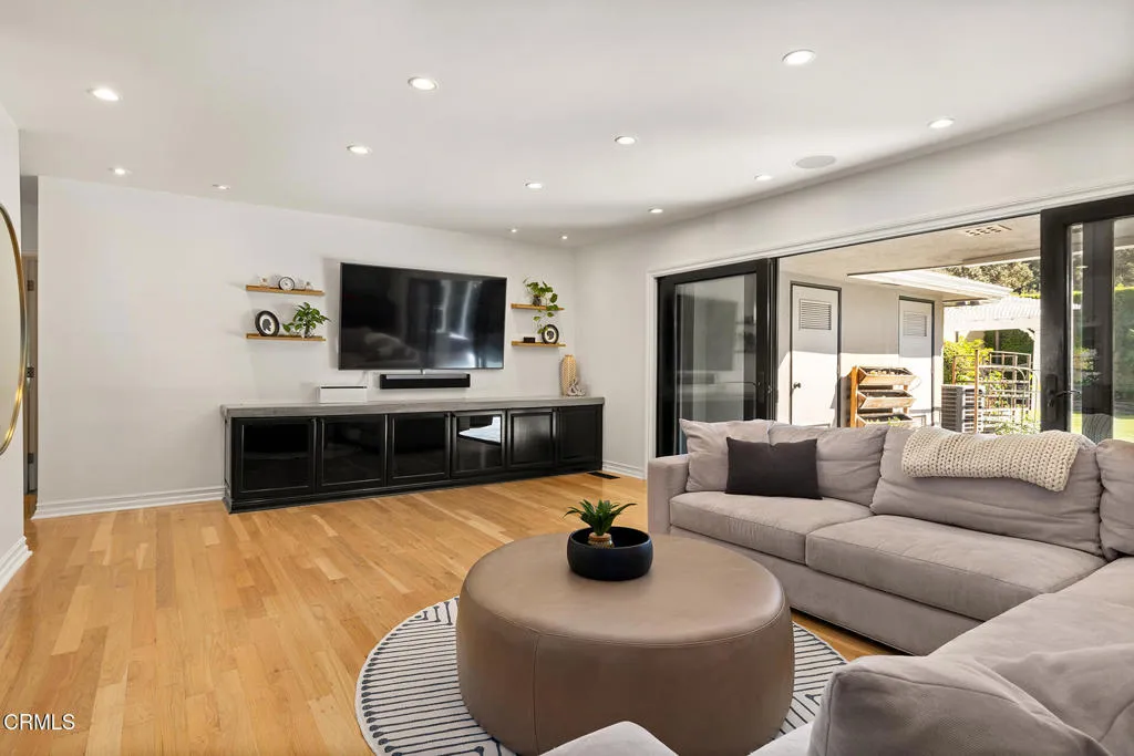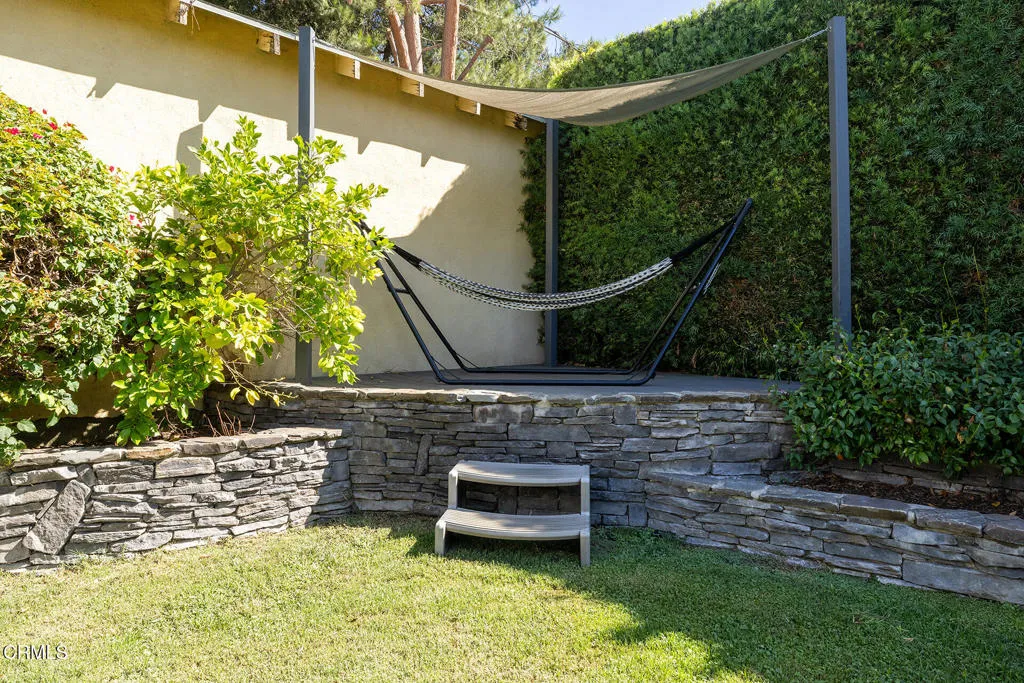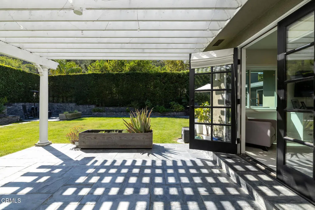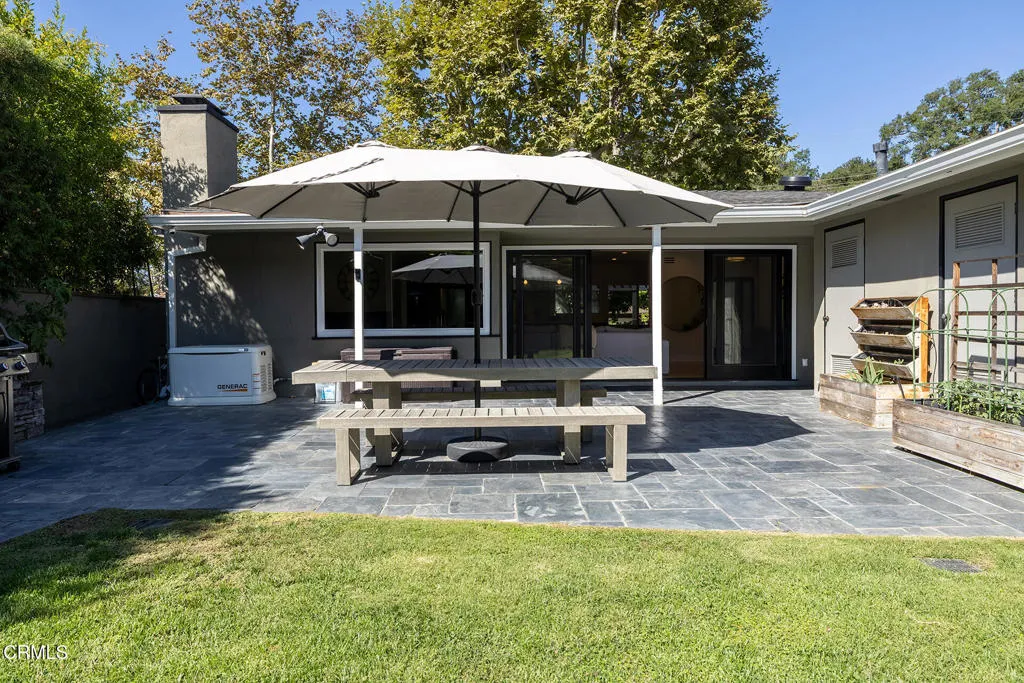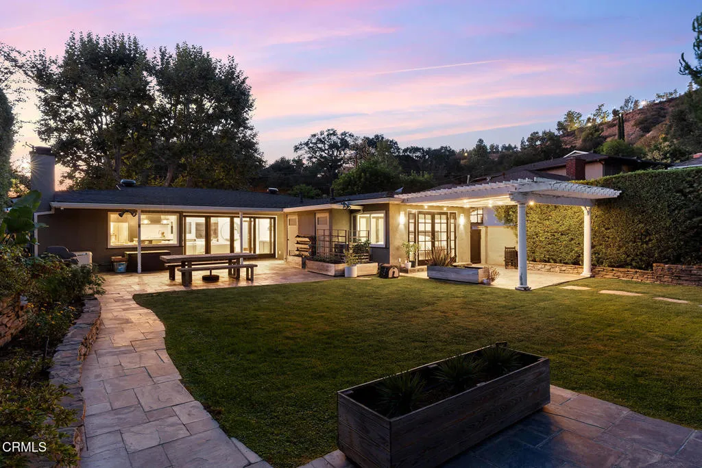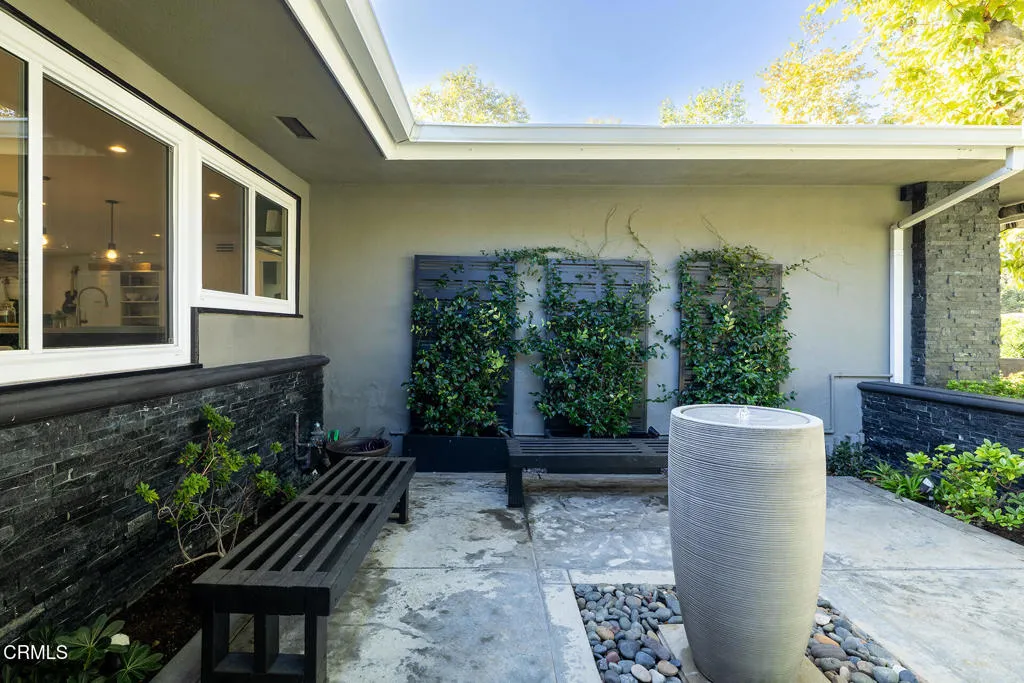 This Glenoaks Canyon Mid-Century Ranch in Northeast Glendale is the perfect retreat just minutes from the city. A walled courtyard entry welcomes you with a tranquil fountain, shaded by a majestic Sycamore tree. Glass entry doors open to an ideal layout featuring a spacious great room concept and a fully renovated chef's kitchen with an oversized island, built-in breakfast nook with bench seating and storage, and an additional beverage station. Large expanses of glass frame the surrounding landscape, bringing the outdoors in while providing a deep sense of privacy and tranquility. Hardwood floors flow through the entry and great room, connecting the kitchen, living room, and dining area accented by a corner fireplace. A large slider opens to a covered patio and beautifully landscaped backyard. A separate laundry area with additional storage and a utility sink offers direct access to the attached two-car garage. The impressive primary suite includes a luxurious spa-like bath with heated floors, a large multi-head steam shower, multiple closets, and French doors leading to a stone patio with a covered trellis. Two additional bedrooms with custom closets share a remodeled hall bath. The inviting backyard includes multiple patios, stone planters, and a grassy lawn with fruit trees, herbs, and vegetables, all completely enclosed by mature hedges providing exceptional privacy. Bonus features include a whole-house generator, newer tankless hot water heater, built-in garage storage, EV car charger, whole-house water filter, upgraded electrical panel, smart thermostat, newer windows
