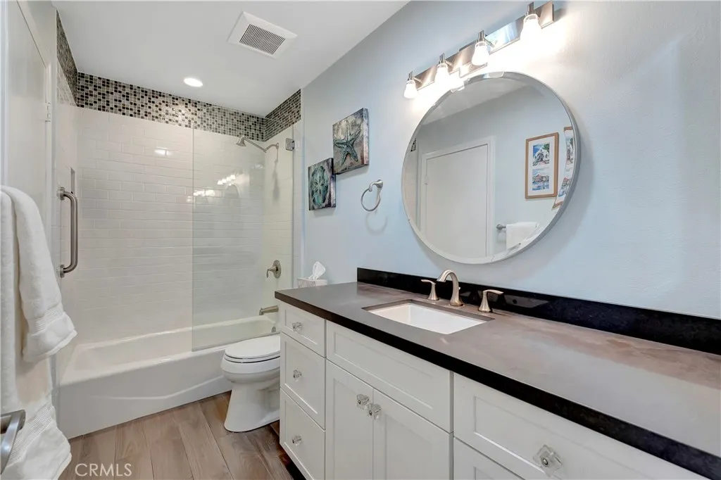 Artists Cottage in Westminster Village Tastefully Updated Two-Story Home! Welcome to this beautifully updated two-story residence in the highly sought-after Westminster Village community, truly embodying the charm of an Artists Cottage. Every detail has been thoughtfully curated, from the inviting front patio to the serene, remodeled backyard retreat. Inside, the home features a bright and open floor plan ideal for entertaining. The spacious living room boasts a romantic fireplace, custom wall paint, scraped ceilings, recessed lighting, and elegant laminate and tile flooring throughout and 1/2 bath first level. The kitchen is a chefs dream, highlighted by a large bay window over the sink that overlooks the tranquil patio, and sliding French doors that open to a private outdoor sitting area. Upstairs, youll find two bedrooms and remodeled 1 full bath with Solar Tube, including an oversized primary suite with a walk-in closet, wall-to-wall mirrored wardrobe, and a built-in organizer. Ceiling fans throughout the home add both style and comfort, while dual-pane windows and plantation shutters enhance energy efficiency and privacy. Additional features include a two-car garage with built-in cabinetry and the refreshing coastal breeze that flows through the home. HOA dues cover fire and earthquake insurance, roof and exterior maintenance, landscaping, and more. Westminster Village offers resort-style amenities including four sparkling pools, tennis courts, three playgrounds, greenbelts, meandering streams, and scenic pathways. The main clubhouse features a large recreation room w