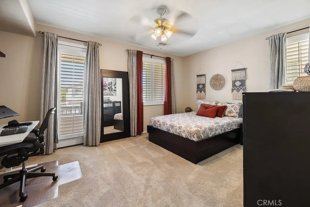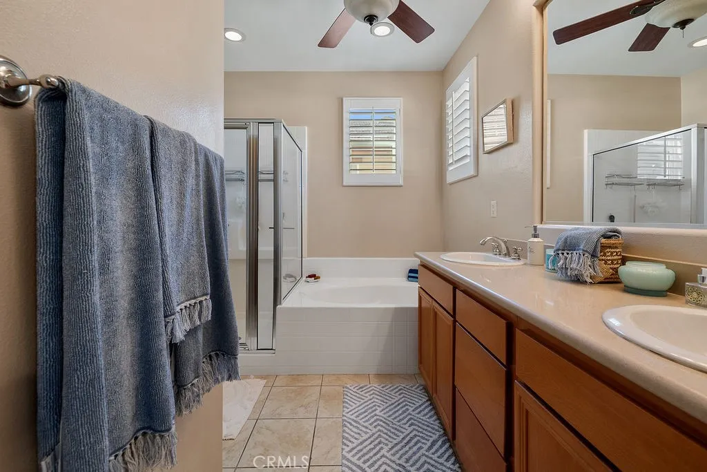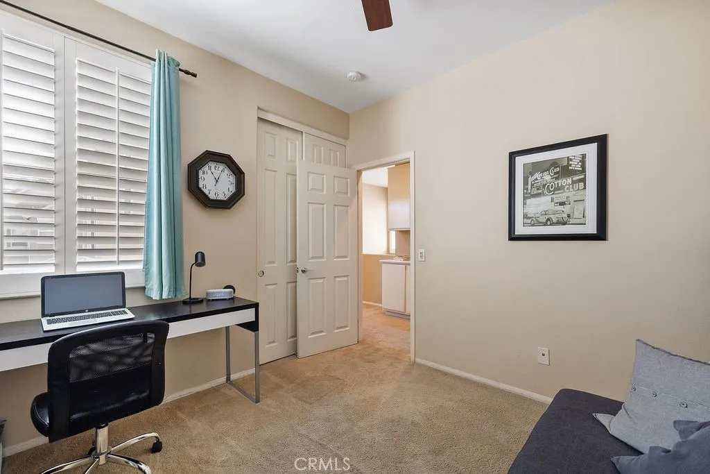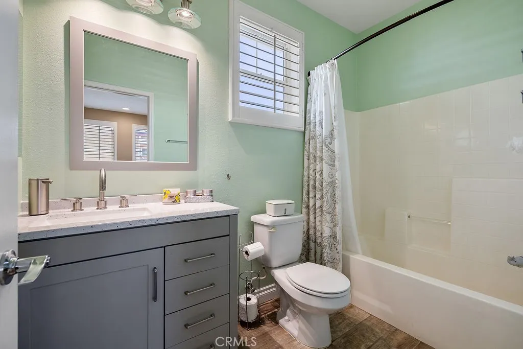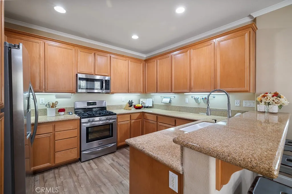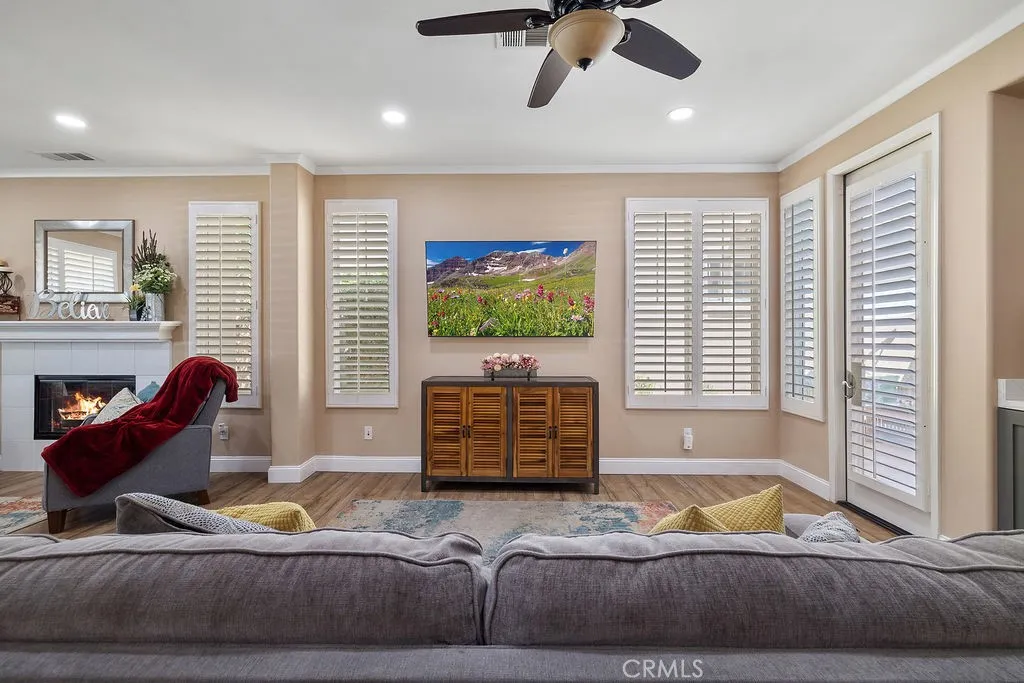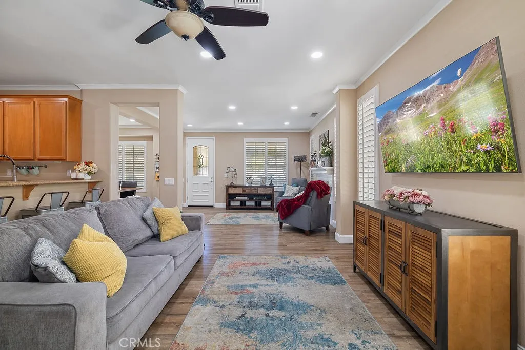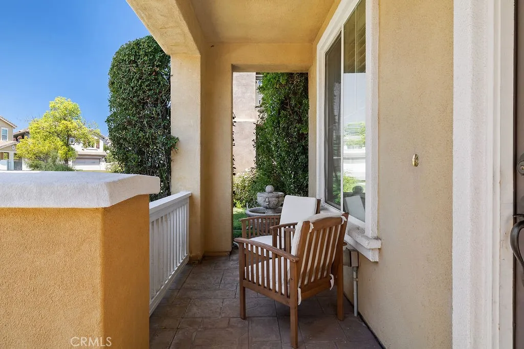 Tucked away on a quiet cul-de-sac in Valencias coveted Creekside community, this beautifully updated home combines modern comfort with timeless design in one of the areas most desirable settings. Set back from main streets, the location offers a sense of privacy and tranquility while keeping you close to the paseos, pools, shopping, dining, and award-winning schools that make Creekside so beloved. Inside, the home immediately impresses with its open, light-filled layout. Wide plank wood-look flooring and classic wood shutters create a warm, cohesive backdrop that flows easily from one space to the next. The living room, framed by abundant windows and anchored by a welcoming fireplace, sets the tone for both everyday living and entertaining. Just beyond, the dining room makes a striking statement with a full wall of custom-built-in bookshelves; equally suited for showcasing a library collection as it is for creating a memorable setting for family gatherings and dinner parties. The kitchen has been thoughtfully appointed with expansive granite countertops, stainless steel appliances, and ample cabinetry for storage. A raised breakfast bar keeps the space connected to the living areas, while an adjacent coffee bar with quartz accents and custom wood cabinetry offers both function and flairan everyday luxury that makes mornings and evenings feel just a little more special. Upstairs, three spacious bedrooms provide room for everyone, including an expansive primary suite that serves as a true retreat. Complete with a private balcony, dual vanities, soaking tub, and separate showe