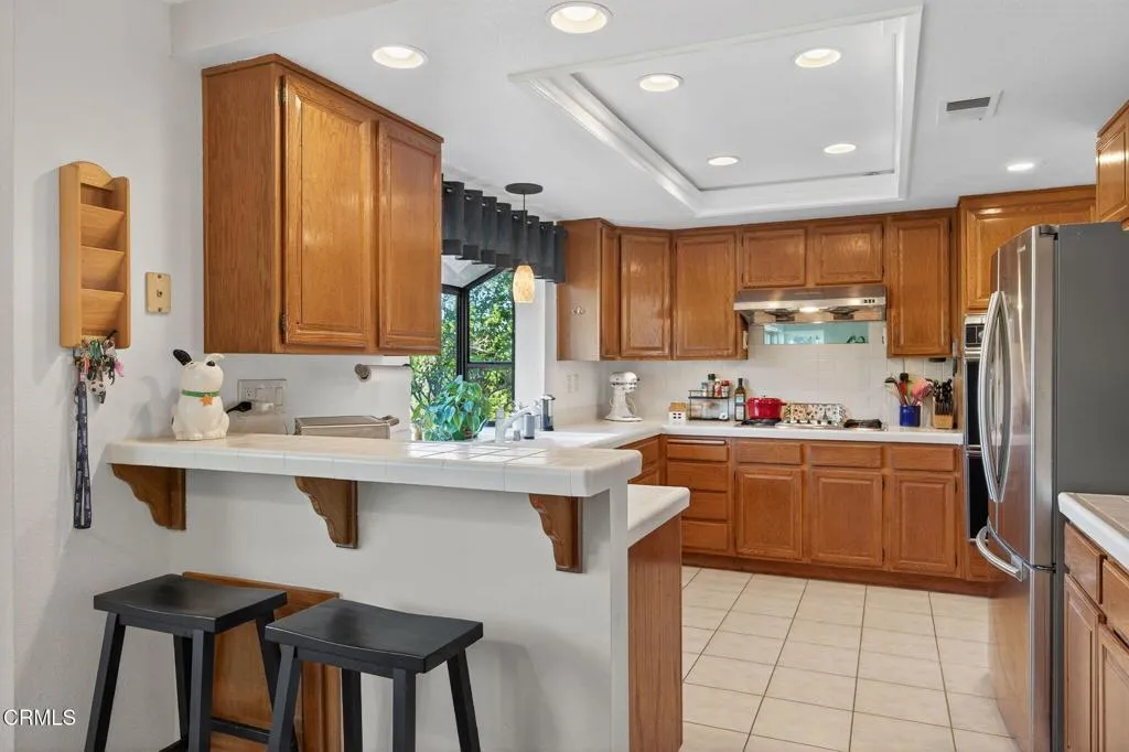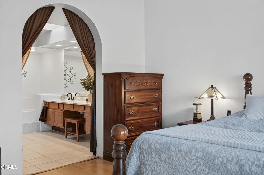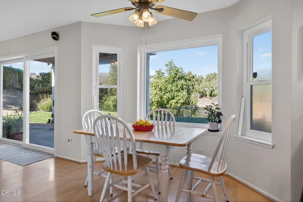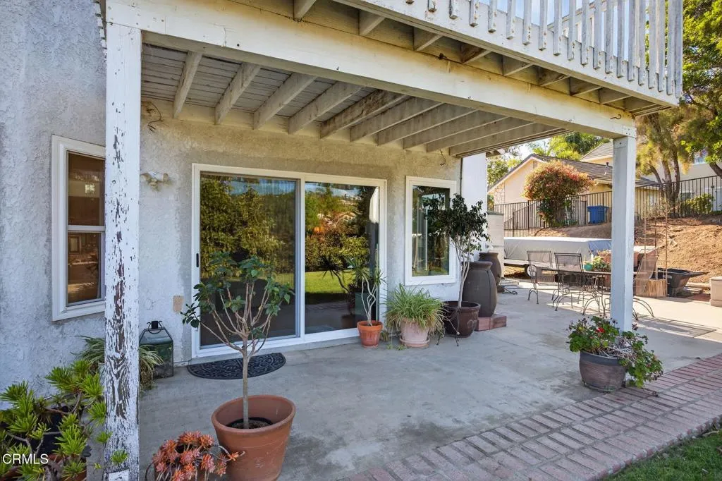 Set on a peaceful half-acre, with incredible views, in one of Camarillo's most inviting neighborhoods, this 2,574 sq. ft. home offers a wonderful place to settle down. You'll love the sense of openness, natural light, and privacy that make this home feel like a private retreat. The custom front walk-way and patio welcome you into the home. Inside, the open layout filled with natural light and high ceilings create a sense of airiness throughout while the floor plan flows effortlessly. A formal living room invites you to settle in by the fireplace while the dining room leads to a side patio for outside dining. The wet bar with custom wood countertop is adjacent to the family room which is highlighted by a fireplace and slider to the backyard making entertaining easy. The kitchen's boasts a walk-in pantry and garden window that perfectly frames the mountains adding enjoyment while cooking. The downstairs features a spacious bedroom with vaulted ceiling, and slider to the backyard -- perfect for guests or a home office with its own outdoor access. Upstairs, the primary suite features vaulted ceilings, dual sinks, a walk-in closet, and a private balcony to take in the panoramic views. Two additional bedrooms share a convenient full bath. Retreat to the backyard for relaxing and entertaining -- with multiple patios, raised garden beds, and 'infinity' grass that seamlessly stretches toward the breathtaking views. Fruit trees (avocado, orange, guava, lemon, grapefruit, and fig) adorn the property, offering both beauty and bounty -- perfect for pets, play, and views. The oversized 3