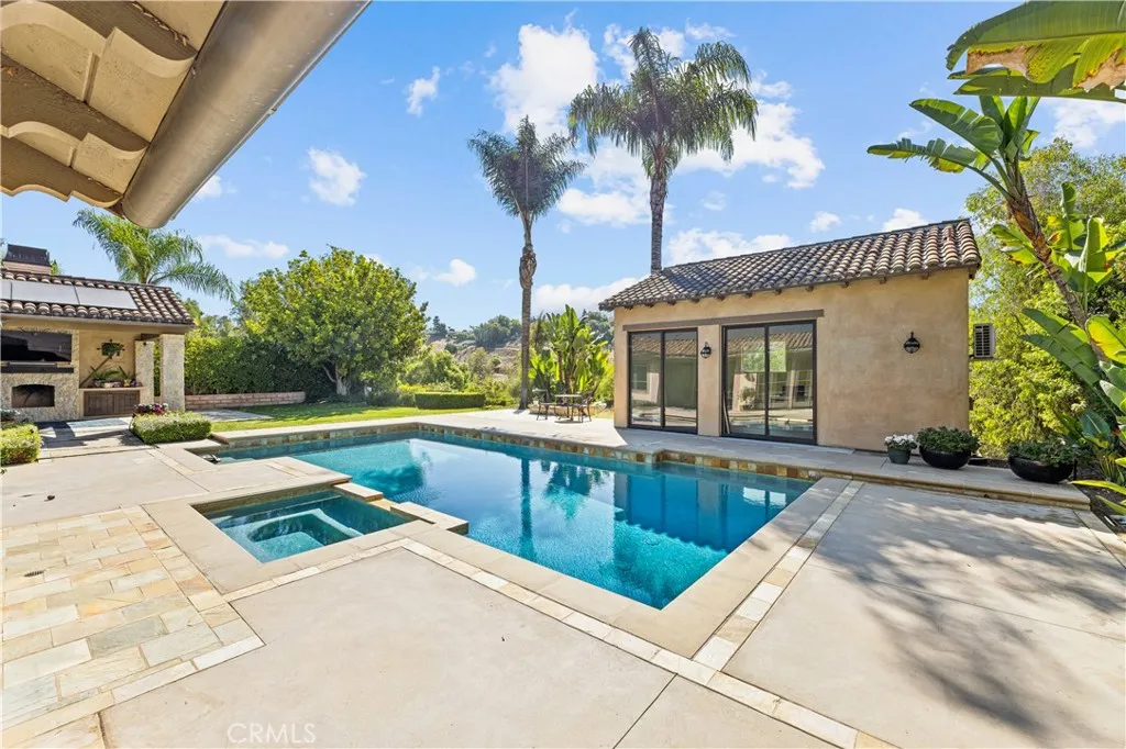 Welcome to 24922 Buckboard Lane, a stunning equestrian estate nestled in the heart of Nellie Gail Ranchone of Orange Countys most sought-after communities. Situated on over half an acre, this meticulously upgraded 5-bedroom, 4 and one half bathroom home offers approximately 4,136 square feet of refined living space, including a detached casita that serves as a perfect guest suite or home office. Designed for both luxury and functionality, the home features owned solar panels, dual water heaters, and a fully integrated Control4 smart home system, offering effortless control of lighting, climate, and media throughout the property. Inside, you'll find distressed French walnut hardwood floors, custom cabinetry, and elegant stonework that elevate every room. The kitchen boasts a 48-inch stainless steel range, dual ovens, a large center island, and a cozy breakfast nook that opens to the backyard. The primary suite is a serene retreat with French doors leading to the outdoor living area, a spa-inspired bathroom with heated floors, a towel warmer, and a custom walk-in closet. Multiple fireplaces, formal and casual living spaces, and thoughtfully designed finishes create a warm, inviting environment perfect for entertaining or relaxing in comfort. Step outside to enjoy true California living in the expansive backyard oasis, complete with a saltwater pool and spa, a custom California room with a fireplace, built-in heaters, and a media wall, as well as a fire pit and multiple lounging areas. For equestrian enthusiasts, the property includes a 4-stall barn, tack room, riding arena, a