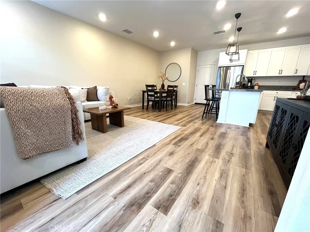 Spanish-style townhome for sale in the Averly community by TriPointe in the South Corona gated Bedford Master Planned community, set against the backdrop of the scenic Santa Ana Mountains. Unique interior location with a large, fenced patio for outdoor entertainment. Paid-off solar panels for instant energy savings. Open-concept main floor where the kitchen finishes include a slide-in stainless steel GE stove/oven, dishwasher, and microwave along with granite kitchen counters, and white Shaker cabinets with matte black pulls. The great room and kitchen areas are equipped with additional recessed LED electrical/lighting, as well as upgraded luxury vinyl plank wood flooring throughout the downstairs areas and leading into the stairway landing and powder room. The home also includes a stacked LG washer/dryer located upstairs. This residence is just over 1,300 square feet, with 3 Beds/2.5 Baths, plus attached 2 car garage wired and ready for EV charging intallation. Beatifully crafted custom solid wooden shutters with sills installed in all downstairs windows and in both guest bedroom's upstairs windows. All bedrooms are pre-wired for ceiling fan or additional lighting. Living room and master bedroom conveniently pre-wired for wall mounting television. Upstairs bathrooms come with upgraded square mitered edge quartz countertops and white shaker cabinets. Homes in this beautiful gated community have access to all of the amenities that the Bedford has to offer. The combined Bedford & Averly HOA fees will be approx. $443. Bedford offers an amazing list of incredible amenities at t