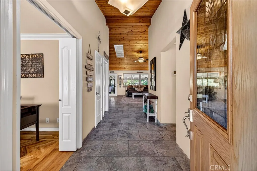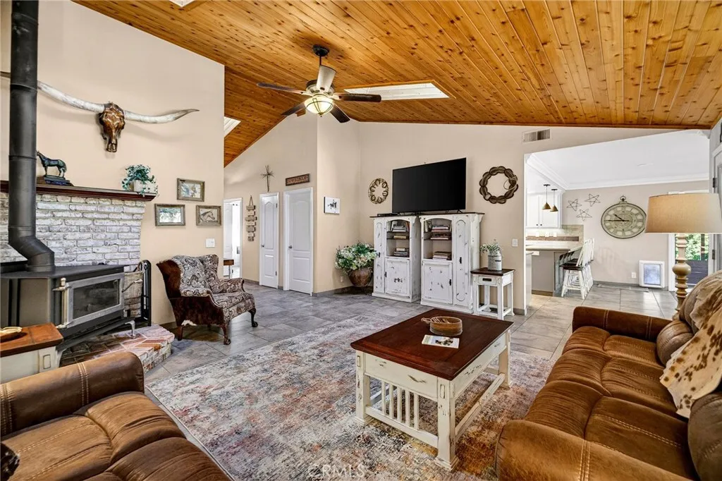 Tucked in the countryside just minutes from town, Roseanna Ranch is where modern comfort meets peaceful country living. This stunning 2.04-acre property has been lovingly renovated and designed for those who dream of wide-open spaces, horses in the pasture, and sunsets over the arena. The beautifully remodeled farmhouse spans approximately 2,100 sq. ft. with 4 bedrooms and 2 bathrooms, offering the perfect blend of rustic charm and modern sophistication. Inside, Italian tile flows throughout the main living spaces, luxury vinyl plank flooring accents the bedrooms, and custom wood flooring adds character to the first floor. The spacious living room features a vaulted knotty pine ceiling with skylights that fill the home with natural light, while an efficient Heat Tech wood stove adds cozy ambiance. The kitchen is a showpiece with quartz/Cambria countertops, stainless steel appliances (new in 2019 & 2023), a garden bay window, and a dining room addition with skylights and built-in china cabinets. The primary suite includes a walk-in shower, a walk-in closet, and elegant finishes. Updates include new doors and windows, crown molding, a whole-house vacuum, fan, Culligan water softener, filtration system, and a new HVAC unit. Step outside and fall in love with the fully fenced and gated acreage, featuring manicured lawns, redwood, birch, crepe myrtle, and maple trees surrounded by colorful perennials and blooming roses. A solar-heated pool with a large patio area provides the perfect setting for entertaining, while raised garden beds and a fenced orchard offer a touch of farm-to