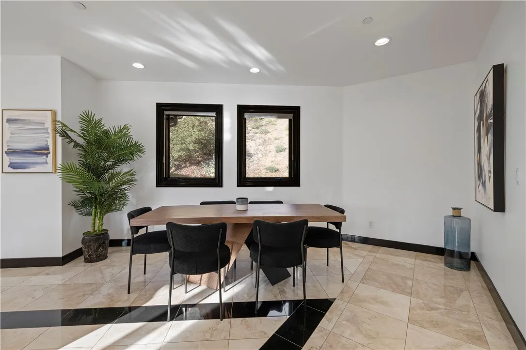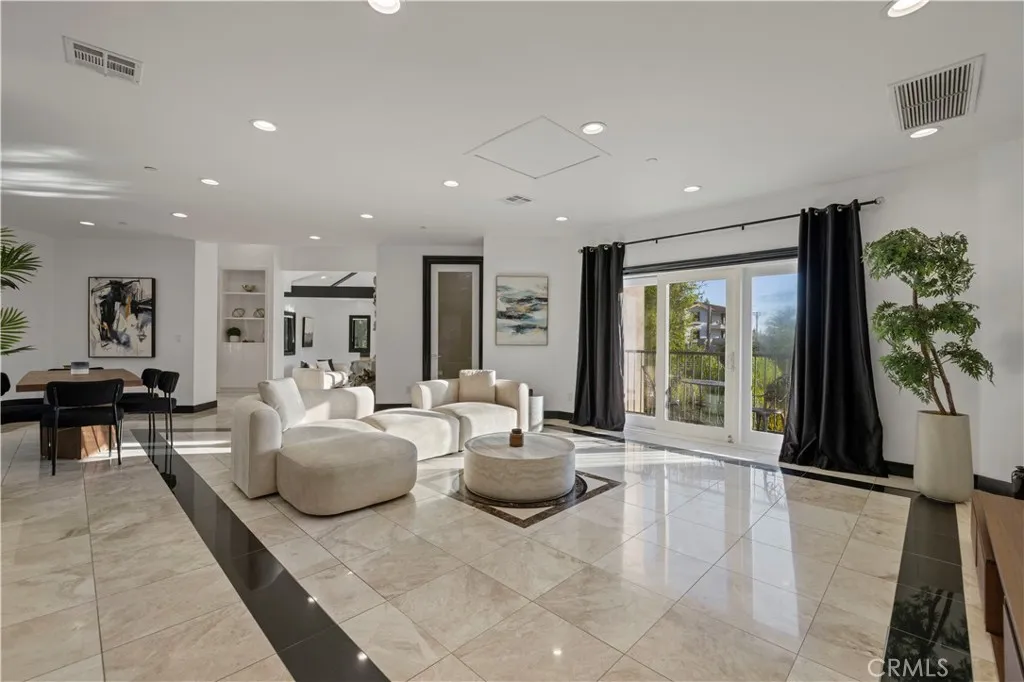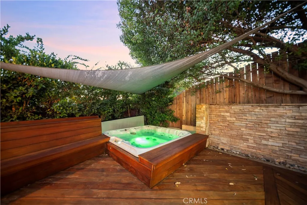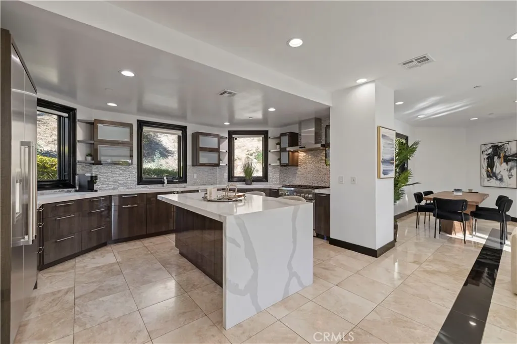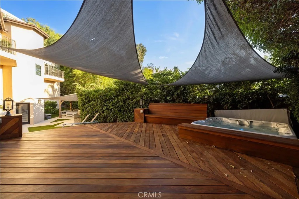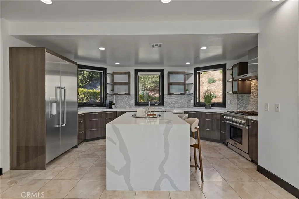 Experience luxury and comfort in this custom-built two-story home, perfectly situated for privacy and sweeping canyon views. The marble foyer leads to a spacious, light-filled living room with soaring ceilings, a cozy fireplace, and balconies overlooking the Hollywood Hills; ideal for family gatherings or entertaining guests. The Italian-designed kitchen is both stunning and functional, featuring quartz countertops, a generous island for casual dining, and premium Thermador appliances. The primary suite offers a serene escape with its own fireplace, dual walk-in closets, and a spa-inspired bath complete with jacuzzi tub and steam shower. Each additional ensuite bedroom is thoughtfully designed with beautiful views and natural light. The lower level opens to a lush, private backyard with covered seating, built-in BBQ, and a raised hot tub with a waterfall perfect for relaxing or hosting loved ones. Equipped with modern comforts including a full security system, dual-zone HVAC, LED lighting, and a new tankless water heater, this home delivers luxury, comfort, and peace of mind in one exceptional retreat.
