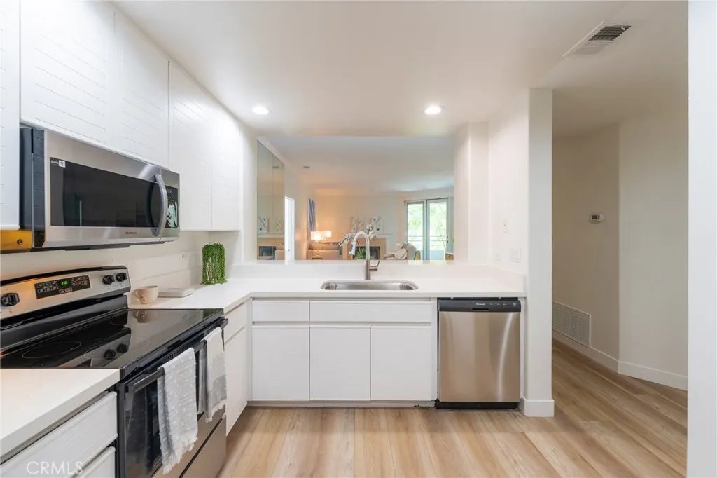 Located on the second floor of Building A within the prestigious guard-gated Metropolitan community, this beautifully updated 2-bedroom, 2-bath residence offers comfort, style, and convenience in one of the areas most sought-after settings. Enjoy tranquil views of lush trees and the sparkling pool from your private living space & balcony. The condo features fresh new paint, wood flooring, and modern quartz countertops in both the kitchen and bathrooms. The kitchen has been fully upgraded with brand-new appliancesincluding refrigerator, range, microwave, and dishwasheralong with a new washer and dryer for added convenience. Both bathrooms have been tastefully remodeled, offering a clean and contemporary look throughout. With two side-by-side assigned parking spaces conveniently located near the elevators, this home combines ease of access with resort-style living. The Metropolitan community provides 24-hour guard-gated security, a pool, spa, fitness center, and beautifully maintained grounds. This stunning condo shows beautifully and is priced aggressively for a quick salea perfect opportunity for homebuyers or investors alike.