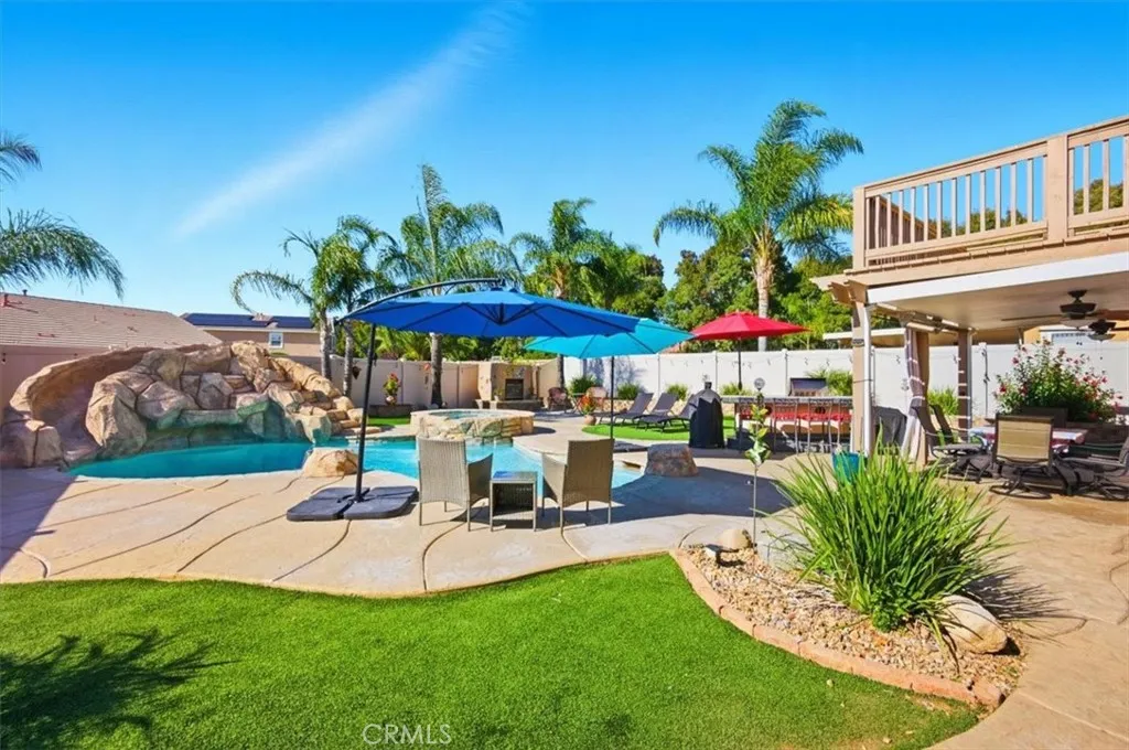 Your Dream Home in the Heart of Sundance! This stunning home offers the perfect blend of luxury, functionality, and year-round funinside and out. Step into your resort-style backyard, complete with a private pool & spa, waterslide, and waterfallideal for entertaining guests or enjoying peaceful family time. The artificial lawn ensures low maintenance, while the Alumawood patio cover adds shade and style for outdoor dining or relaxing. Fire up the built-in grill next to the outdoor fireplace or enjoy tranquil views from your private upstairs balcony, or practice putting on your own putting green. A park down the street with a playground to take your children or walk your dog/s. Inside, youll find a meticulously maintained, model-quality interior featuring: A spacious Great Room floor plan with a built-in entertainment center Stylish and energy-efficient plantation shutters throughout, as well as crown moulding A well-appointed kitchen with granite countertops, white cabinetry, and stainless steel appliances A convenient laundry room located just off the kitchen A versatile downstairs office/den, located next to a guest bathroomperfect for visitors or working from home Upstairs, the luxurious master suite offers: Double French doors leading to a private balcony overlooking your backyard oasis A walk-in closet, dual sinks, a separate soaking tub, and a walk-in shower Built-in Bluetooth speaker/sound system for ultimate comfort and convenience Additional highlights include: The side yard could be made into a dog run or garden area Small built-in fireproof safe in the