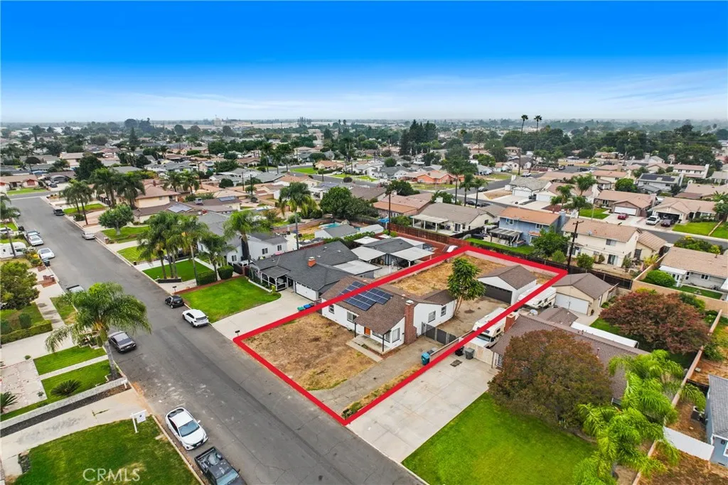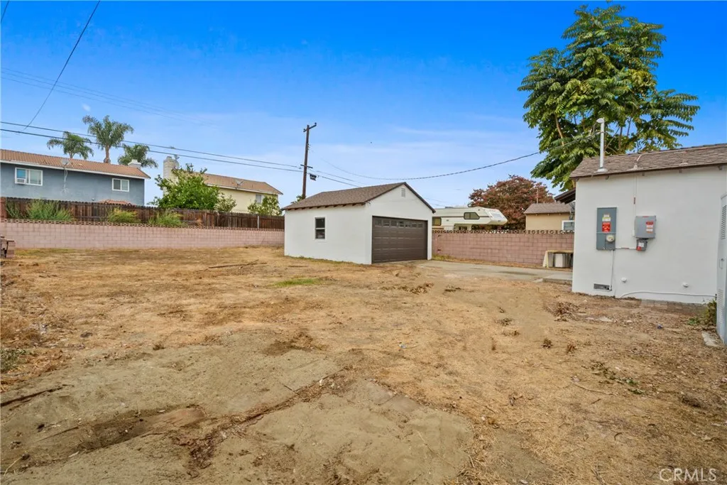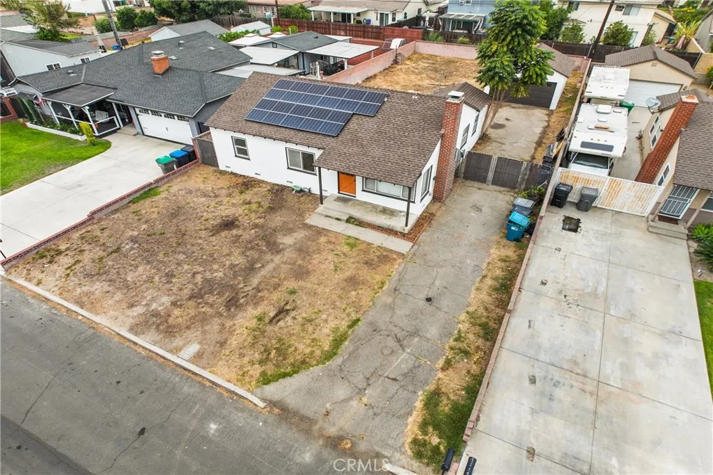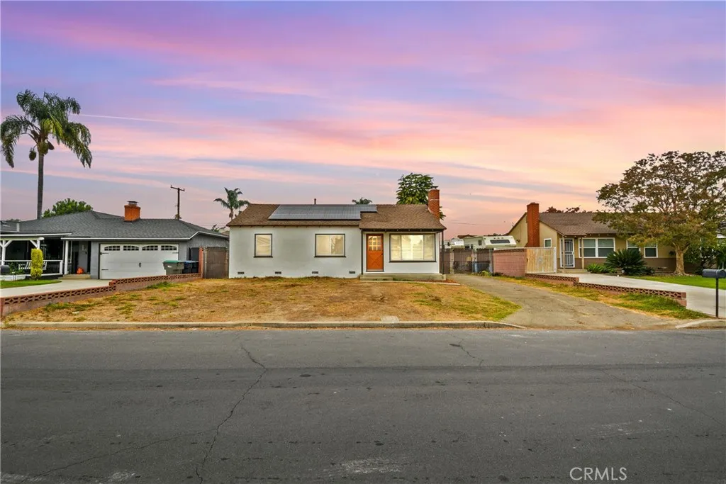 Welcome to this delightful Mid-Century Traditional home, featuring paid-in-full solar panels, 3 bedrooms, 1.5 baths, and 1,164 sq ft of living space on an expansive 8,340 sq ft flat lot. The large lot offers direct driveway access to the backyard and a detached garage, perfect for an ADU conversion, RV parking, or storage for work or recreational vehicles. The exterior has been freshly painted in warm, earth-tone hues, giving the home a clean and inviting look. Youre greeted by a charming front porch, setting the tone for this light, bright, and freshly updated interior. Inside, enjoy new luxury vinyl plank flooring, upgraded baseboards, new windows, plantation shutters in the family and dining rooms, and fresh interior paint throughout. The cozy family room centers around a classic brick fireplace, leading into the inviting kitchen with freshly painted cabinets, matte-black hardware, tile countertops, and a breakfast bar that opens to the dining area with an upgraded ceiling fan. All three bedrooms are spacious, and the hall bath features a shower-in-tub, freshly painted cabinetry, new matte-black hardware, and tile counters. The powder room includes a newer sink and toilet, while the interior laundry room offers built-in shelving for convenience. Additional highlights include a newer AC system with thermostat, new toilets, and a newly painted exterior including garage and trim. The newer automatic garage door adds function and curb appeal. The front and backyard are open canvases, ready for your creative touch. Whether you envision a landscaped retreat, an outdoor enterta