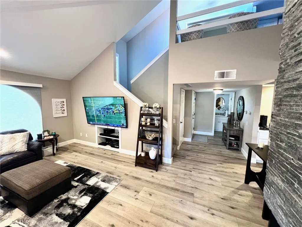Welcome to your serene retreat at the Las Fuentes gated community in Huntington Harbour. This beautifully upgraded 2-bedroom + loft, 2.5-bathroom townhome offers a spacious and open floor plan, perfect for entertaining. Every detail has been thoughtfully remodeled to create a stylish modern living space. The designer kitchen boasts ample storage and counter space, allowing the chef to interact with guests in the dining and living areas. The kitchen, dining and living room each offer direct access to the adjacent patio filling the space with natural light and create a bright, inviting atmosphere- perfect for indoor-outdoor entertaining. Newly installed electric shades on all three sliding doors provide both privacy and convenience. The bar area with wine fridge is easily accessible from the dining area, making it perfect for hosting. The living room features soaring ceilings and striking gas-burning fireplace creating a cozy yet grand atmosphere. Conveniently, there is a guest bathroom downstairs and direct access to the attached two-car garage. Upstairs, you will find two generously sized suites, each with vaulted ceilings and walk-in closets. The primary suite offers a private balcony overlooking the lush central grounds, providing a peaceful spot to enjoy summer nights. The loft space is an excellent addition, perfect as an office or a potential third bedroom. For added convenience, the side-by-side laundry areas is located upstairs. The community offers lush landscaping with fountains, a pool, spa, sauna and clubhouse. Enjoy the Huntington Beach lifestyle just minutes fr
