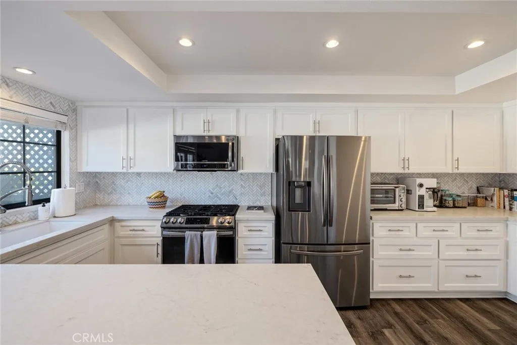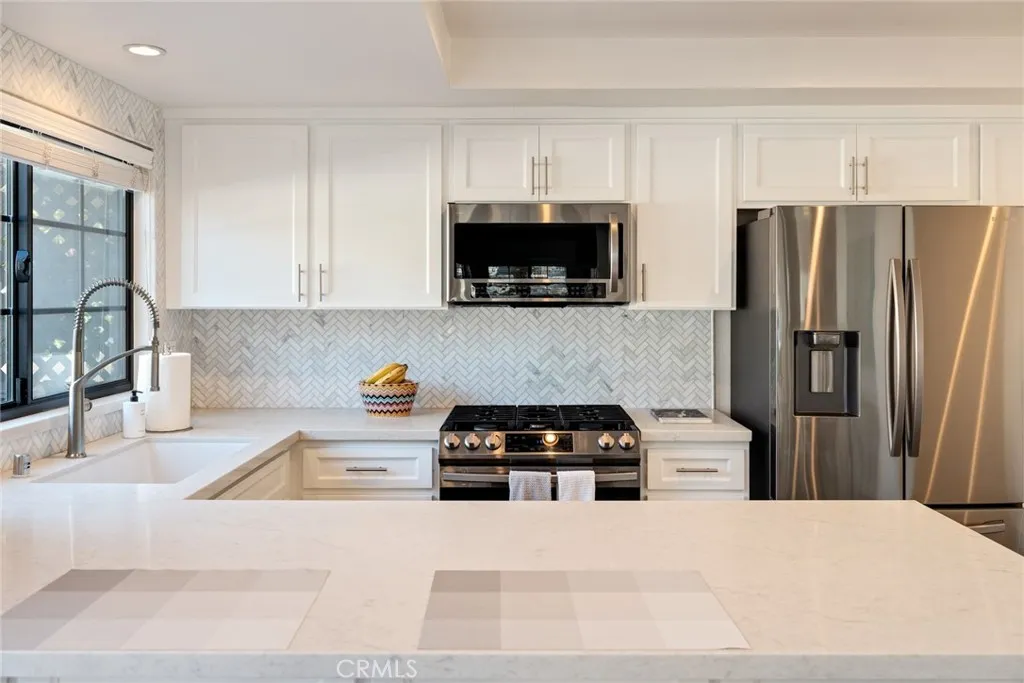 FULLY FURNISHED home for sale! Welcome to this bright and airy 3 bedroom/3 bathroom home that boasts 1900 square feet of comfortable living space, located West of PCH & a very short walk to the beach, pier, strand, restaurants, shopping, nightlife and comes fully furnished! Yes, that is correct, it comes fully furnished with all indoor and outdoor furniture included in the sale! What a package!! Just pack your bags and move right in! Not to mention that it is an end-unit, with additional privacy and some neighborhood views. The main floor features a large and gorgeous fully remodeled kitchen with quartz countertops, quartz sink and Samsung appliances. Loaded with tons of cupboard space and a pantry! The kitchen area opens-up to an over-sized private patio large enough to entertain friends and family. The super cozy living room has a bright bay window that looks out onto the tree lined street of the iconic S. Broadway & comes equipped with a corner fireplace and beautiful waterproof oak-style flooring. The main level also includes a comfortably sized half bath. Upstairs you will find 2 bedrooms, each with their own en-suite bathrooms and generous closet spaces. The primary bedroom has a walkout balcony and dual sinks in the bathroom. On the lowest level you will find an additional large bedroom which could also be used as a home office, home gym or a play room for children! The home has direct garage access as well!