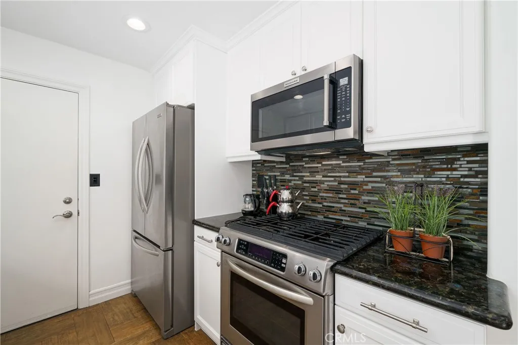 Welcome to your turn-key beautifully upgraded modern 2 bedroom, 2 bathroom, SINGLE-LEVEL end unit home in the prestigious South Lake community of WOODBRIDGE! Enter through a beautifully manicured front yard welcomes you with lush, low-maintenance artificial grass and a charming white picket fenceoffering classic curb appeal with modern convenience. Step into this light and bright home featuring a spacious living room with soaring cathedral ceilings that create an airy, open ambiance. A custom-built entertainment center anchors the space with style and functionality, perfectly complemented by a cozy fireplace that adds warmth and charm. This stunning Updated Kitchen combines style and function with granite countertops, a designer glass tile backsplash, and a spacious ceramic farmhouse sink and breakfast bar. Soft-closing cupboards provide a quiet touch of luxury, while sleek stainless-steel appliances offer both elegance and performance. Spacious primary suite featuring mirrored closet doors, built in closet and a modern barn door leading to a tiled en-suite bath. Enjoy a walk-in shower with dual shower heads, a dual-sink vanity, updated lighting, and two medicine cabinets for extra storage. Second bedroom features a built-in closet and its own charming private patio. Guest bathroom includes a bathtub and a new mirror. New paint, new carpet, built-in closets, custom entertainment center, newer HVAC, ceramic wood-look flooring, and designer shutters throughout. Enjoy private back patio. Perfect for entertaining, sitting/lounge space, A built-in gas BBQ station, complete with
