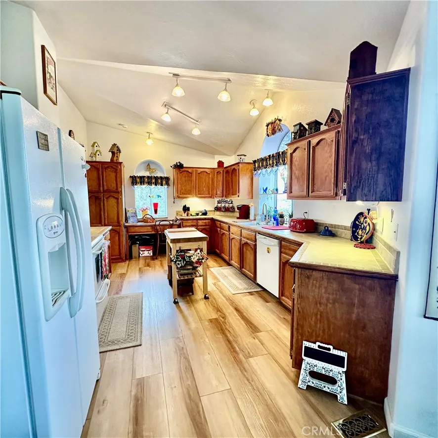 Peaceful Lakeview Living 2 Bed + Office | 2 Bath | Lake Views Welcome to your dream retreat a beautifully maintained 2-bedroom + office, 2-bath manufactured home that blends comfort, style, and breathtaking natural beauty. Nestled in a hill top location, this charming residence boasts beautiful lake views from your living room and private deck, offering a daily dose of tranquility. Step inside to find an open-concept layout flooded with natural light. The spacious living area features large picture windows that frame the lake view and nature, while elegant finishes and neutral tones create a warm, inviting atmosphere. The kitchen is a modern delight, with matching appliances, generous counter space, and a cozy breakfast area perfect for morning coffee with a view. The primary suite is a restful haven, complete with a private en-suite bath featuring dual sinks and a soaking tub. A second bedroom and full guest bath offer ample space for family or visitors. The dedicated office/den provides the perfect work-from-home setup or can be easily converted into a guest room, hobby space, or reading nook. Outside, enjoy your lake view and morning coffee or evening wine on the deck, taking in the sights and sounds of nature. The lot is landscaped for easy maintenance, and there's plenty of space for gardening or relaxing. Completely fenced in, RV parking and detached 2 car garage. Whether you're seeking a peaceful primary residence or a weekend escape, this lake view gem offers the perfect blend of low-maintenance living, scenic beauty, and modern comfort.