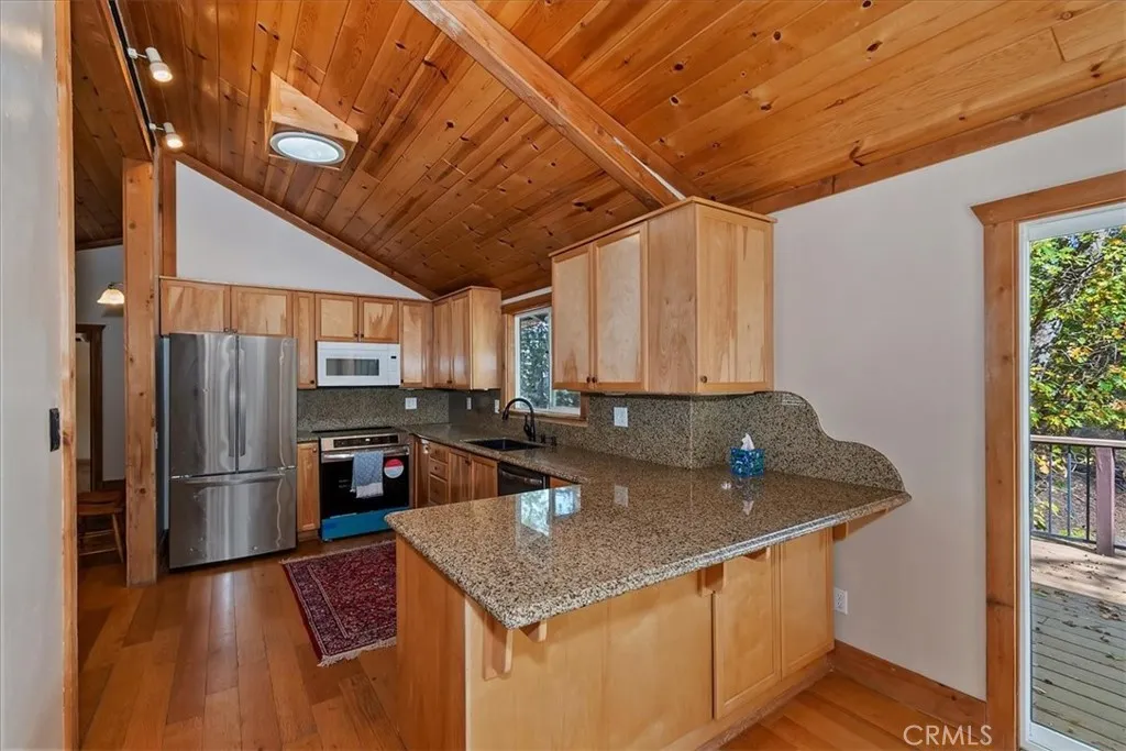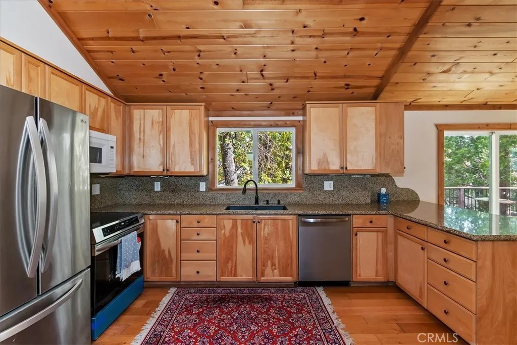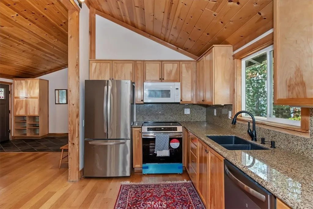 Charming Single-Level Mountain Home in Arrowbear Cul-de-Sac Street with Trail Access! Centrally located Arrowbear, short distance to Snow Valley or hour to Big Bear or down the hill to Highland / Redlands. This well-loved 3-bedroom, 1-bathroom home offers the perfect blend of comfort and convenience, with true single-level living with just three easy steps to the front door, level off-street parking (room for 3+ vehicles), one under carport. Inside, you'll find a warm, inviting interior featuring wood ceilings, a cozy wood-burning stove, newer vinyl windows, and mini-split systems in every room for efficient heating and cooling. The updated kitchen boasts stainless steel appliances (dishwasher brand new) and induction range is brand new (faster and safer than gas), newer cabinetry, and granite countertopsideal for home cooks and entertainers alike. Fresh paint throughout gives this home a crisp, move-in ready feel. Sustainable living comes easy with solar panels (owned), a Tesla charger, a 200 AMP electrical panel and fully insulated (unlike many other mountain homes). Step outside to enjoy low-maintenance Trex decking, beautiful spring blooms and fruit trees across three included lots, and direct access to nearby trailsperfect for hike, bike or nature walks right from your home. Bonus features include a spacious unfinished basement with windows, offering great potential for a workshop, or extra storage. Whether you're looking for a full-time residence, a vacation getaway, or a rental opportunity, this home has everything you need in a peaceful, nature-filled setting. Com