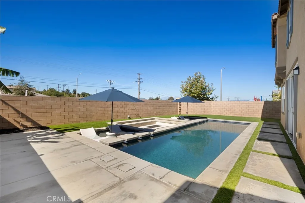 POOL | DOWNSTAIRS BEDROOM | PAID OFF SOLAR | Discover modern luxury and comfort in this beautifully upgraded residence located in the desirable Madeira community of Riverside. Featuring over $130,000 in enhancements, this newer construction home blends sophisticated design with everyday functionality. Upon entry, youre greeted by a welcoming foyer that leads past a conveniently located downstairs bedroom and full bath, ideal for guests or multi-generational living. The open concept great room serves as the heart of the home, showcasing a custom entertainment area with built-in shelving and a contemporary fireplace that anchors the space. The adjoining kitchen features quartz countertops, a central island that provides additional prep space, stainless steel appliances, and abundant cabinet space, creating an ideal setting for both entertaining and family gatherings. Luxury vinyl plank flooring extends throughout the lower level, enhancing the modern feel and durability of the home. A large double sliding glass door opens directly to the resort-style backyard, seamlessly connecting indoor and outdoor living. The backyard is an entertainers dream, highlighted by a custom modern pool, a large sunken fire pit with built-in seating, synthetic turf, and low-maintenance landscaping in both the front and back yards. The extended driveway adds convenience and curb appeal. Upstairs, the spacious primary suite offers a relaxing retreat with a spa-inspired bathroom featuring dual vanities, a soaking tub, a separate shower, and a generous walk-in closet. Additional bedrooms and a versati