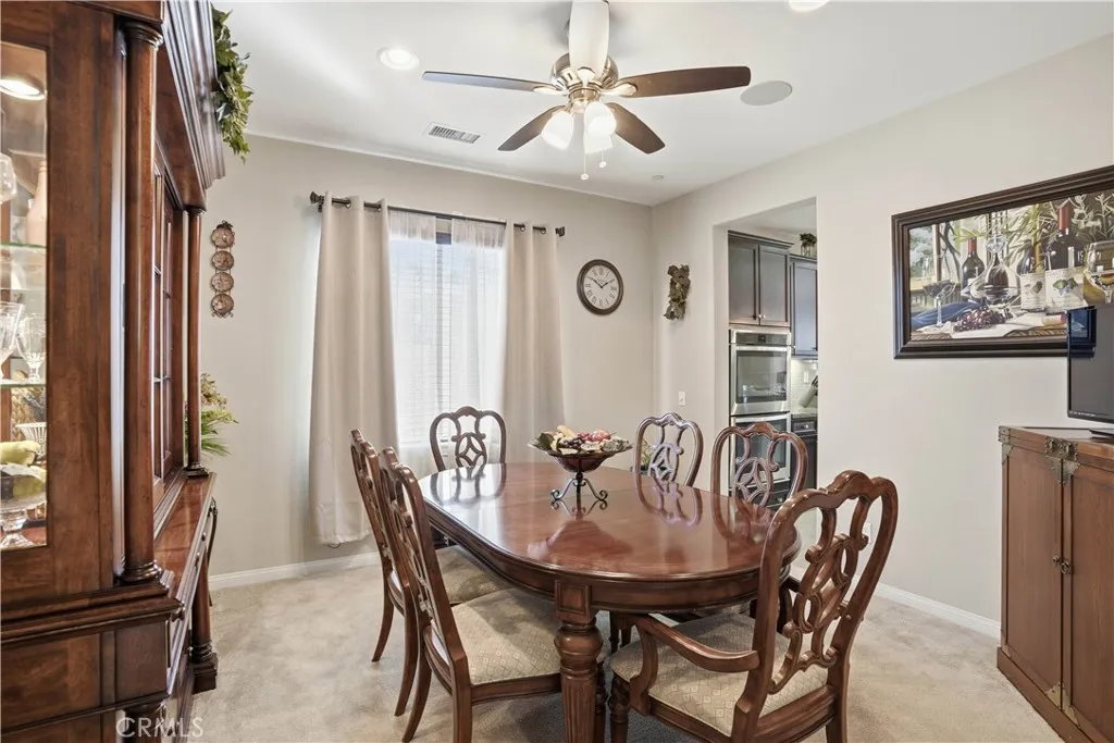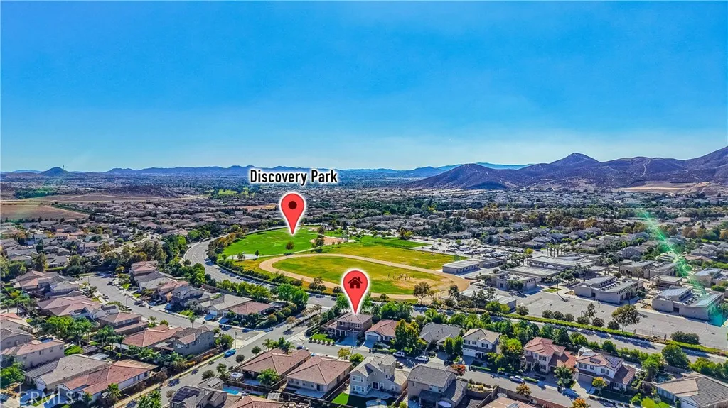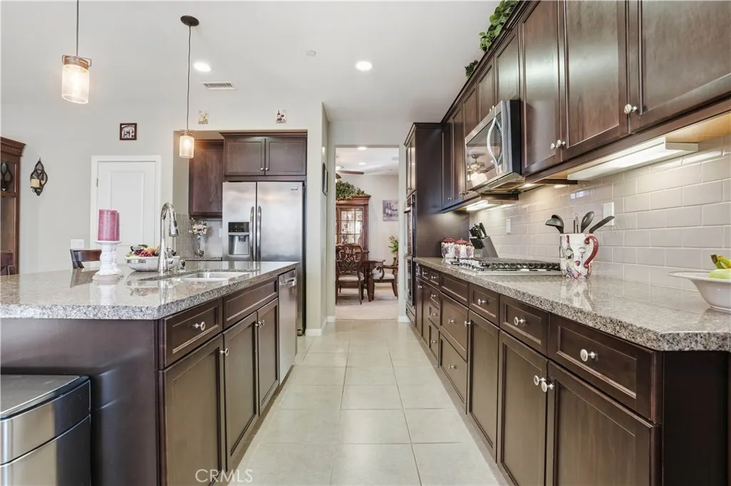 MOVE IN READY! Welcome to this lovely home with a bright, open floor plan that's perfect for everyday living and entertaining. You'll love the spacious great room right off the kitchen, ideal for gatherings with family and friends. This spacious family room allows you to relax and enjoy the views of the beautiful landscaping and nearby hills and mountains. The gourmet kitchen features granite countertops, mocha cabinetry, extra cabinets, double oven, 5 burner cook top, large island with breakfast bar and a nice size pantry. Just off the kitchen is a formal dining area and from there you'll find a full downstairs bedroom and bathroom. Perfect for guests or a comfortable home office. As you head upstairs there are three additional bedrooms plus an open loft featuring extra recessed lighting. a perfect entertainment area and for a pool table. The convenient upstairs laundry room adds even more functionality. Outside, enjoy a private backyard with a block wall, large side yard, Alumawood patio cover with a ceiling fan ideal for relaxing or hosting gatherings. The oversized three car garage provides plenty of space for parking and storage with epoxy flooring and has a tankless water heater. So many HOA amenities include 2 pools, lake, splash park for kids, pickleball, tennis courts and much more! A must see!