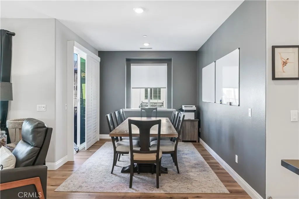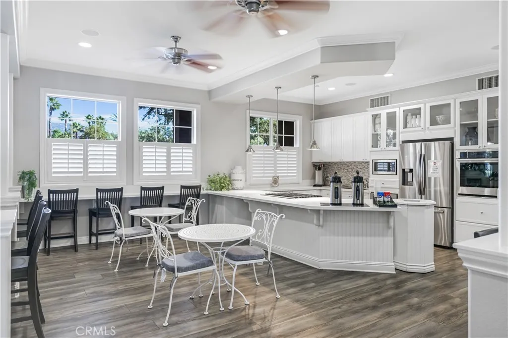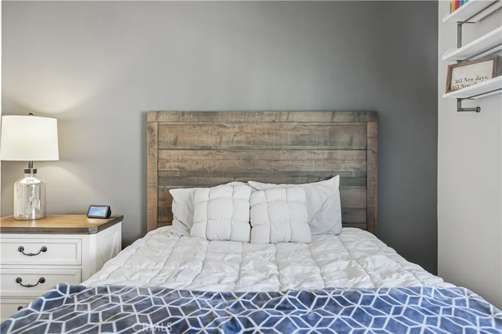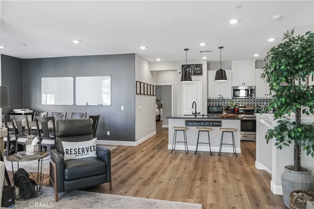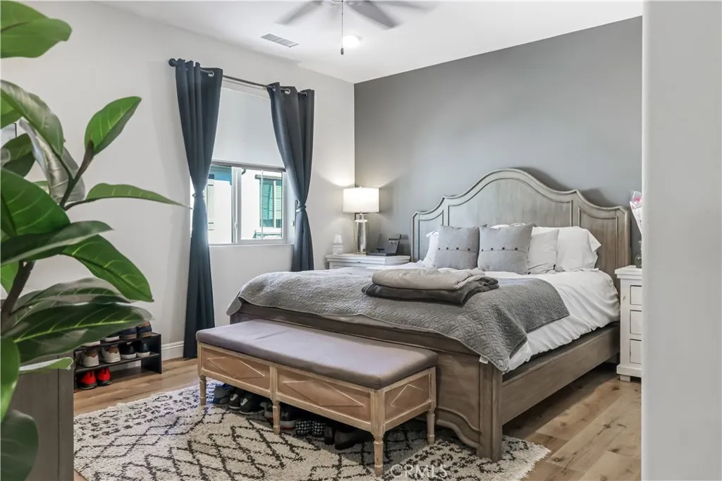Welcome to your move-in ready home in the desirable Shady Trails community! This beautifully upgraded 2-bed, 2-bath condo offers 1,311 sq ft of modern comfort and style. The open-concept kitchen features GE stainless-steel appliances, a Samsung refrigerator (included), tile backsplash with metal framing, pendant lighting, and elegant dark-gray quartz counters that continue into both bathrooms. Upgraded waterproof laminate flooring runs throughout, complemented by recessed lighting and custom blinds that allow in natural light while maintaining privacy. The spacious primary suite includes a sliding barn door leading to the ensuite bath and a Hunter ceiling fan with remote. Smart features include app-controlled lighting in key rooms, a Ring doorbell, Wi-Fi extenders, and a MyQ smart-garage system with built-in camera. Additional highlights include epoxy-coated garage flooring, upgraded black hardware, keyless front entry, and abundant storage with dual kitchen pantries and attic access. Enjoy your private balcony with full-perimeter privacy screening and plantation-style shutters. Refrigerator, stackable washer and dryer, and all ceiling fans are included. Condo is equipped with solar through Sun Strong Management under a lease of $75.26 per month. Buyer to assume solar lease at the close of escrow. This home combines thoughtful upgrades, energy-efficient features, and modern convenienceall within a vibrant gated community near parks, shops, and freeway access.
