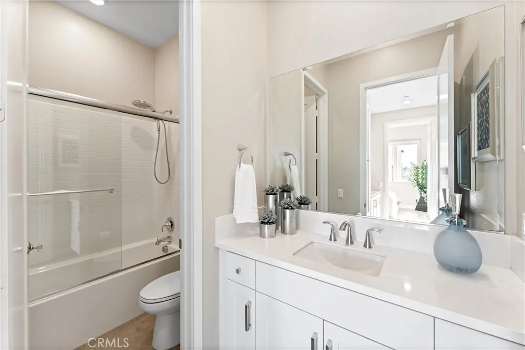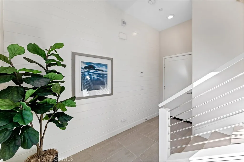Welcome to 419 Transport in the Levity community at Tustin Legacy, a former model home with a premium corner location offering ample natural light and elevated views. This three-story, single-level living flat features 3 bedrooms, 3 bathrooms on the same floor, and a versatile third-level entertainment space that opens to a spacious rooftop deck. The 2,546 sqft home impresses with modern, designer finishes at every turn, from motorized roller shades and lighting to wallpaper accents, custom shiplap, and large-format porcelain tile throughout. The main level lives like a single-story home, with the kitchen, great room, bedrooms, baths, and laundry all situated on one floor. The expansive great room is anchored by a striking floor-to-ceiling tile fireplace wall and a balcony that overlooks the community area. The kitchen blends style and function with quartz countertops, a full herringbone backsplash, a walk-in pantry, GE Profile stainless steel appliances, pendant lighting over the generous island, and integrated under-cabinet lighting. All three bedrooms are thoughtfully positioned on this level, including a refined primary suite, a secondary ensuite bedroom enhanced by French doors that open to a charming Juliet balcony, and a spacious third room. The primary suite offers large windows, a feature wall backdrop, and an ensuite bath with a KOLER smart bidet toilet, an oversized walk-in shower with stacked glossy white subway tile, and hexagon mosaic flooring. The third floor features a bonus room with a dry bar and a charcoal-toned tile fireplace wall set in a modern herring