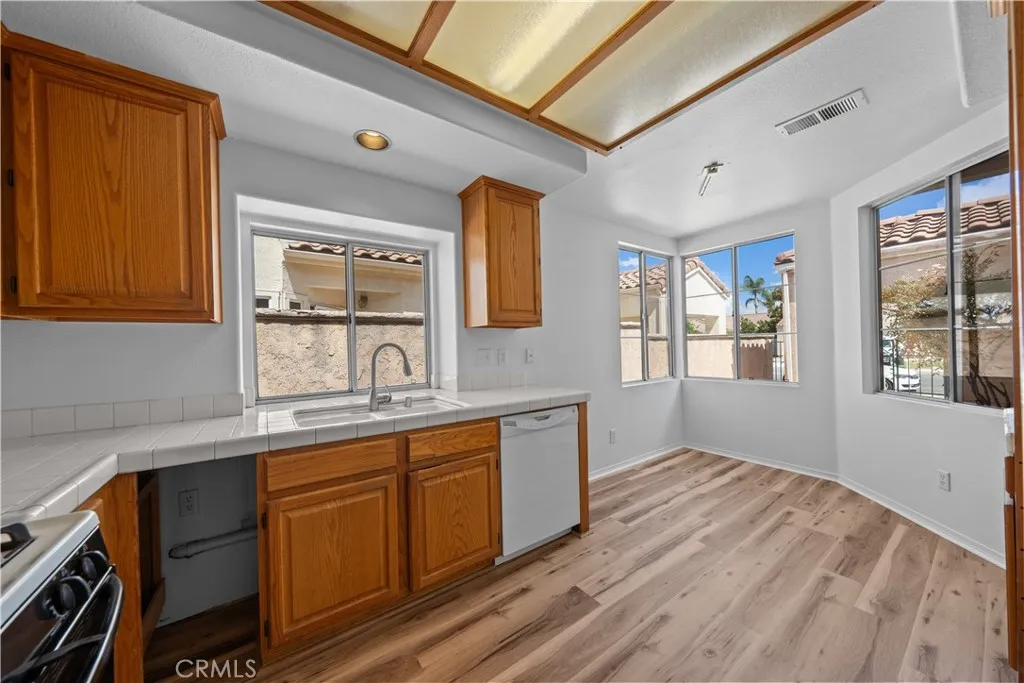 ***PRICED TO SELL**NOT a 55+ community**Welcome to this beautifully updated single-story courtyard home in the highly desirable Andalusia community of Menifee Lakes Golf Course! Discover the perfect blend of comfort, charm, and lifestyle in this home set right on the fairway in Menifee Lakes. With 2 bedrooms plus a den that is literally ready to be a THIRD BEDROOM by adding only a DOOR, 2 full bathrooms, and 1,466 square feet, this light and airy residence delights you with vaulted ceilings, fresh paint, and brand-new flooring throughout. The open layout is anchored by a double-sided fireplace that connects the family and dining rooms, creating an inviting space for gatherings or quiet evenings in. The kitchens bay windows and breakfast nook bring in natural light, while the spacious primary suite features dual mirrored closets and a slider leading to the covered patio. Step outside to enjoy breathtaking golf course views and glowing sunsets, perfect for entertaining or relaxing in the mild California climate all the while set on a backdrop youll never tire of. Additional highlights include indoor laundry with cabinets, ample storage with multiple linen closets and garage cabinetry, and a low-maintenance yard. The gated courtyard entry adds privacy and curb appeal, absolute perfection for the upcoming trick-or-treaters! Life in Menifee Lakes offers more than just a home its a lifestyle. Enjoy the resort-style amenities, spend sunny days at the private Beach Club with its lagoon-style pool, sandy beach entry, water slide, and BBQs, or enjoy paddle boating, miles of scenic