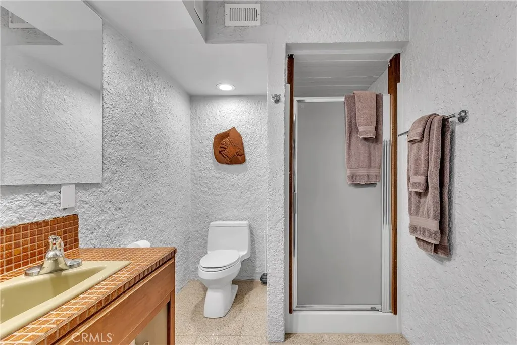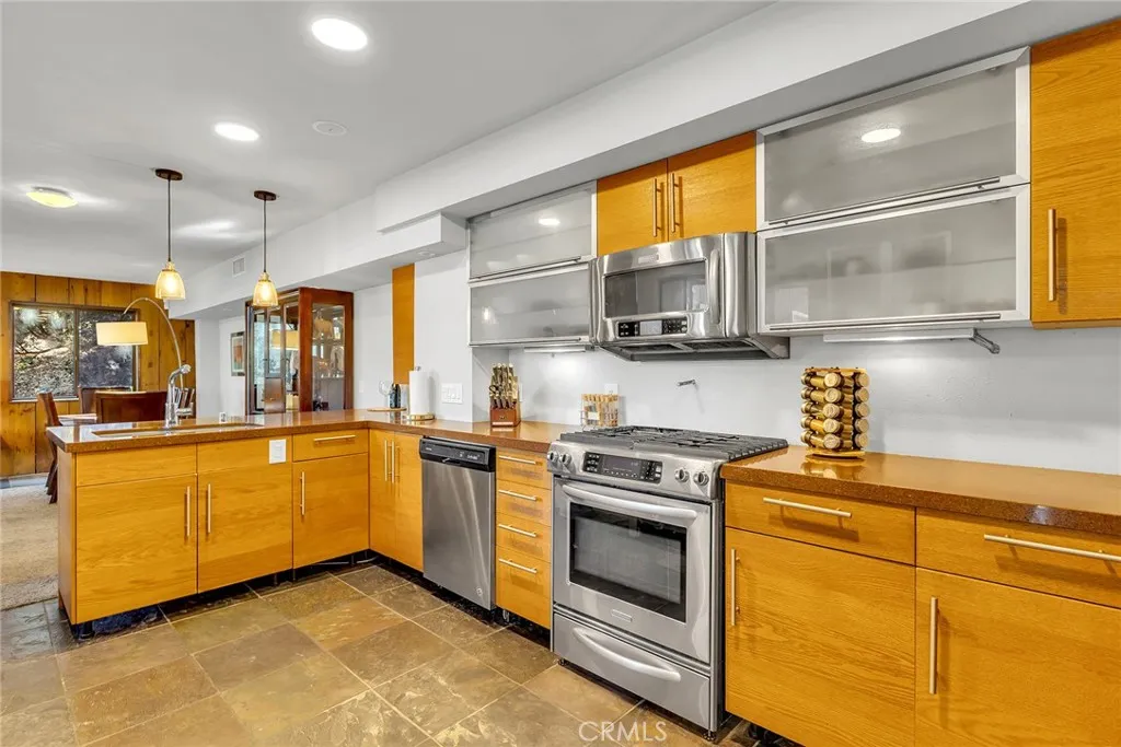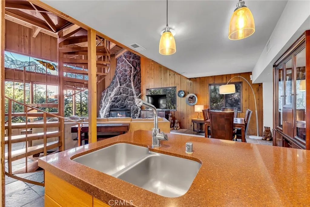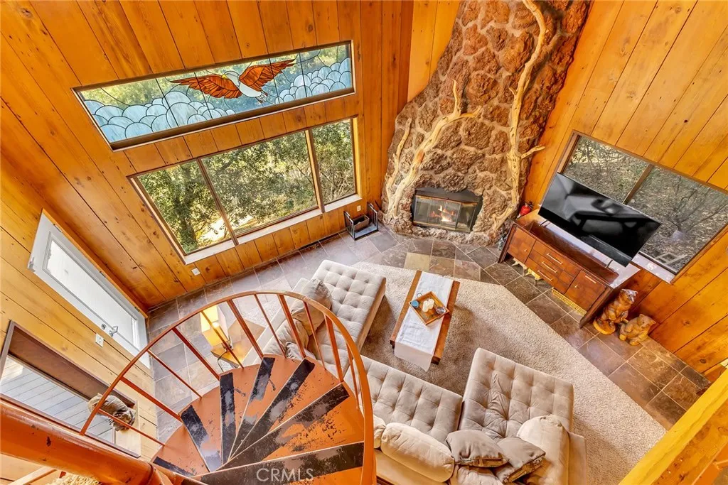 Sited high above the street in the quiet Cedar Glen neighborhood, this warm and inviting mountain home is surrounded by towering pines, dramatic boulders, and a peaceful sense of retreat. Thoughtfully remodeled and designed for comfort, the main level welcomes you with an open living space anchored by a striking floor to ceiling rock fireplace crafted with sculpted manzanita branches. Vaulted ceilings and large windows fill the room with soft natural light, creating a true treetop atmosphere. The living, dining, and kitchen areas blend together with an easy, connected flow. The kitchen features custom cabinetry, quartz counters, stainless appliances, and a breakfast bar perfect for casual meals or gathering with friends. Stained glass windows facing southeast add warmth, color, and morning glow to the space. A comfortable bedroom and bath on this level allow for simple single level living, and the main deck offers an ideal spot for relaxing in the forest setting. A spiral staircase leads to the upper floor, where the home opens into several flexible, welcoming spaces. A generous game room with a wet bar offers an enjoyable area for entertaining or weekend fun. Just beyond, a secluded sitting area provides a peaceful space for a home office, reading nook, or additional sleeping area as needed. This sitting area opens to a private front deck perched above the trees. The upstairs bedroom enjoys direct access to the expansive backyard patio, framed by pines and natural rock formations, and offers convenient access to the upper parking area from Highway 243. The upper level also