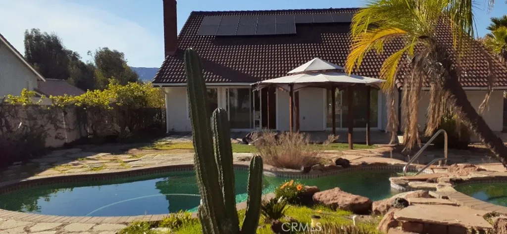 This single-story Solar Powered Home is located in the Victorian Estates Community. Its situated on a .46-acre lot in one of the most desirable neighborhoods of Wildomar. NO HOA and LOW PROPERTY TAX 3-bedroom 2-bath, 1812 sq ft home is the perfect combination of functionality, and charm. Enjoy the open floor plan, high beam ceilings, spacious living and dining room, skylight and pot shelves throughout the home to show off your pretty collectable. Designer ceiling fans and light fixtures, professionally laid tile floors and freshly painted interior. Lots of natural light in kitchen with huge windows, newer wood cabinets, large breakfast bar with drop pipe shelf, colorful pendent lights and a cozy bonus room with brick fireplace which leads out to the patio and swimming pool. Backyard has a variety of mature trees and flowers for a park like setting, custom tile patio with a gazebo and lots of steppingstones leading to the pool and different areas of the yard. Completely fenced with gate entrance for possible RV parking and one shed for storage. New carpet in all three bedrooms. The master has 2 large closets and patio glass doors leading out to the pool. The attached bathroom has custom tile designs in the shower and a colorful slate floor. Large 3 car garage has lots of room for storage in the high ceiling rafters and washer and dryer hookups. Minutes to the 15 Freeway, with quick access to shopping, schools, hospitals, restaurants and the famous Lake Elsinore which is the largest freshwater lake in Southern CA, with boating, fishing, and water sports.